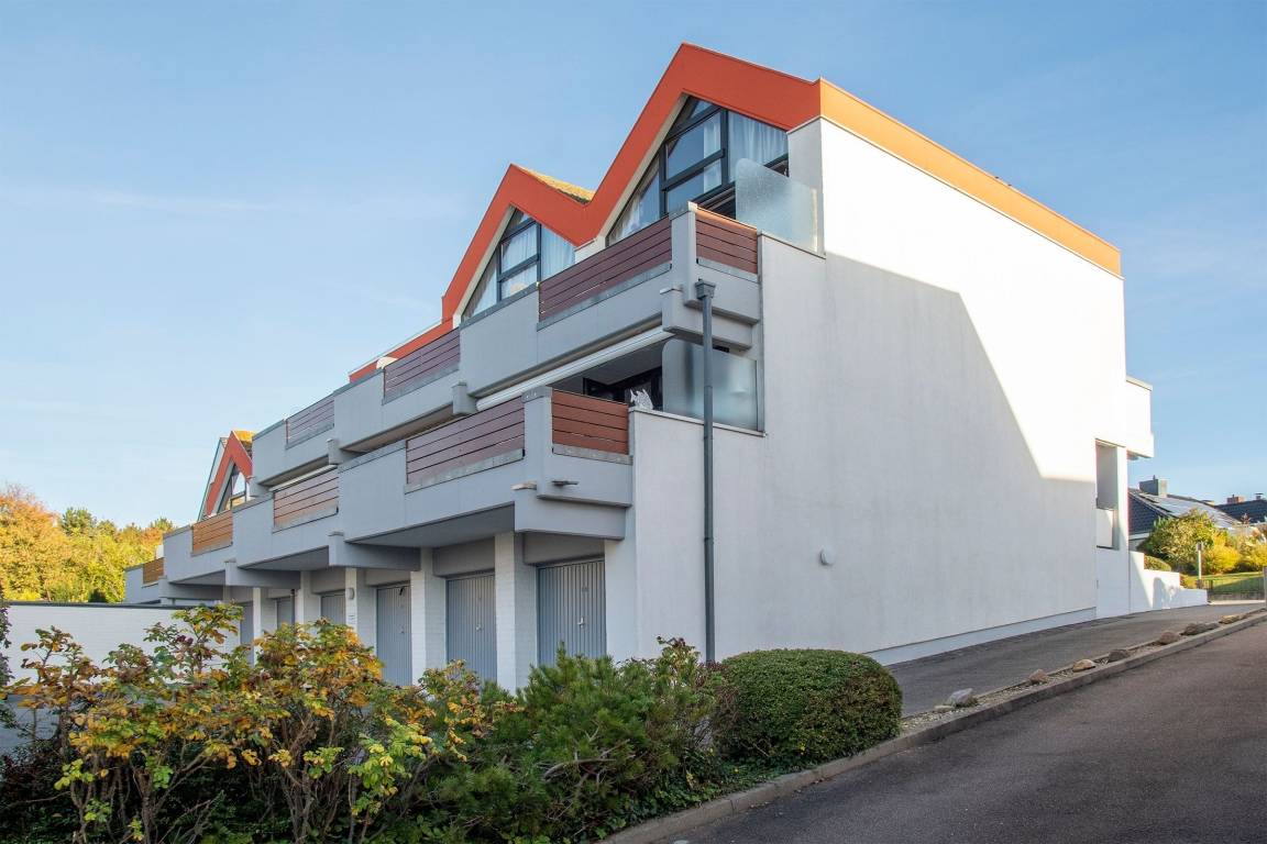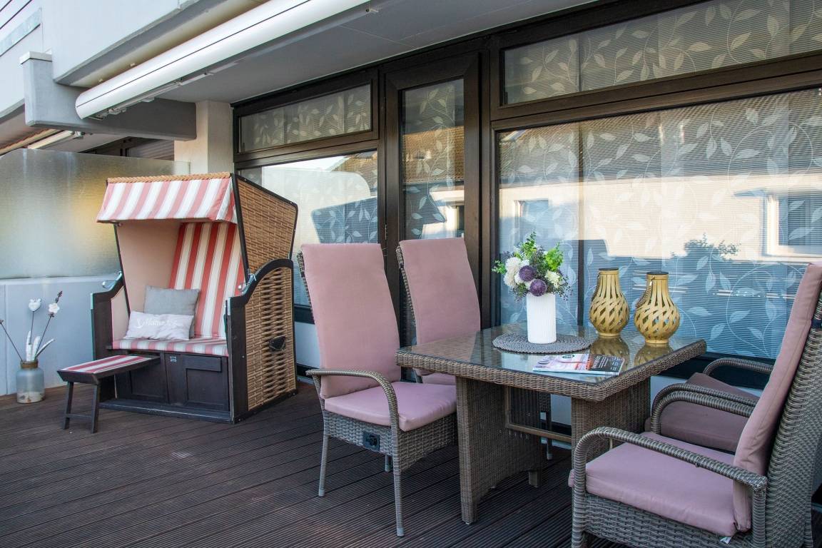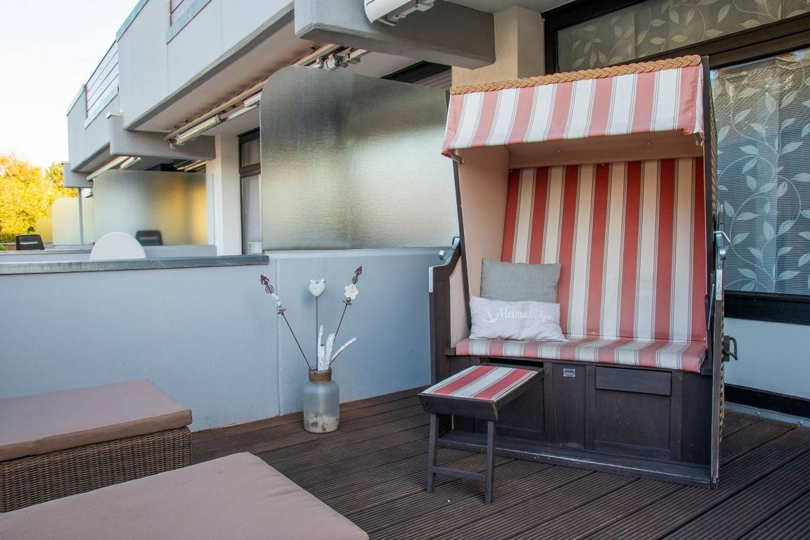 Diese moderne, ca. 49 m² große 3-Zimmer-Ferienwohnung in Hanglage bietet Ihnen eine ca. 20 m² große Holzterrasse mit Strandkorb und Markise, die für Erholung sorgt.