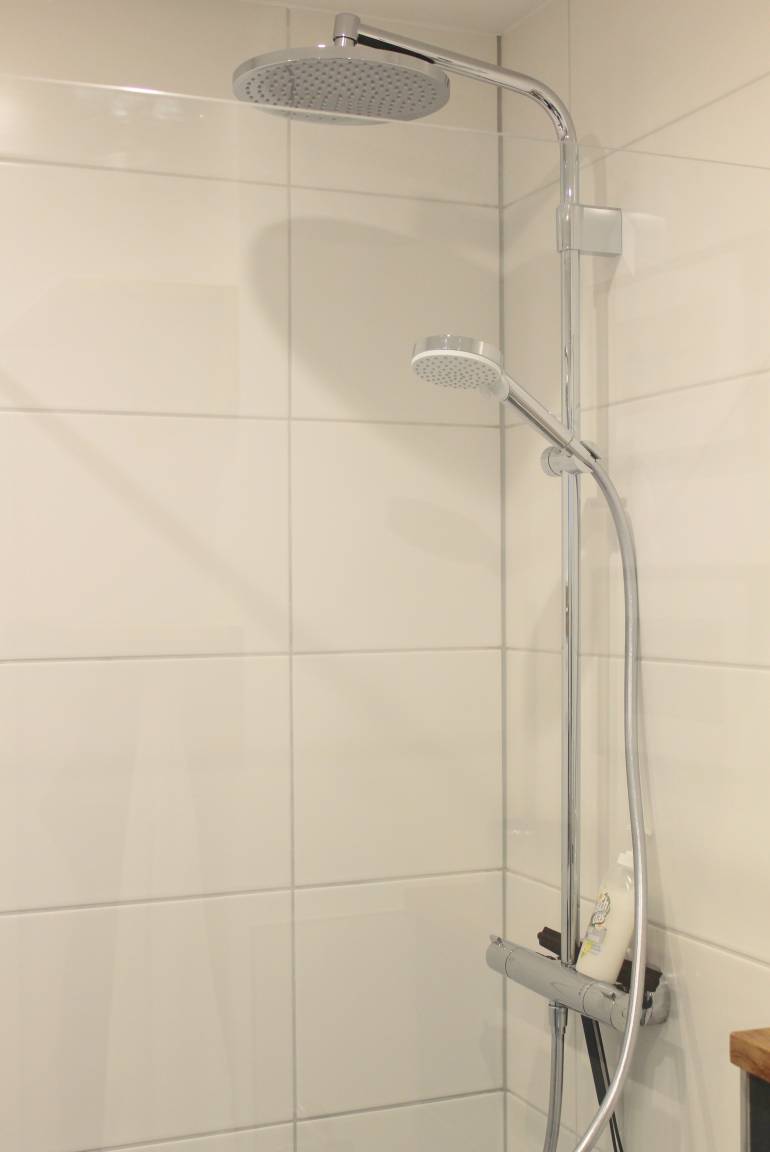 Das moderne Duschbad mit Regenduschkopf und Klarglas-Duschabtrennung bietet alle Annehmlichkeiten, um den Tag zu beginnen.