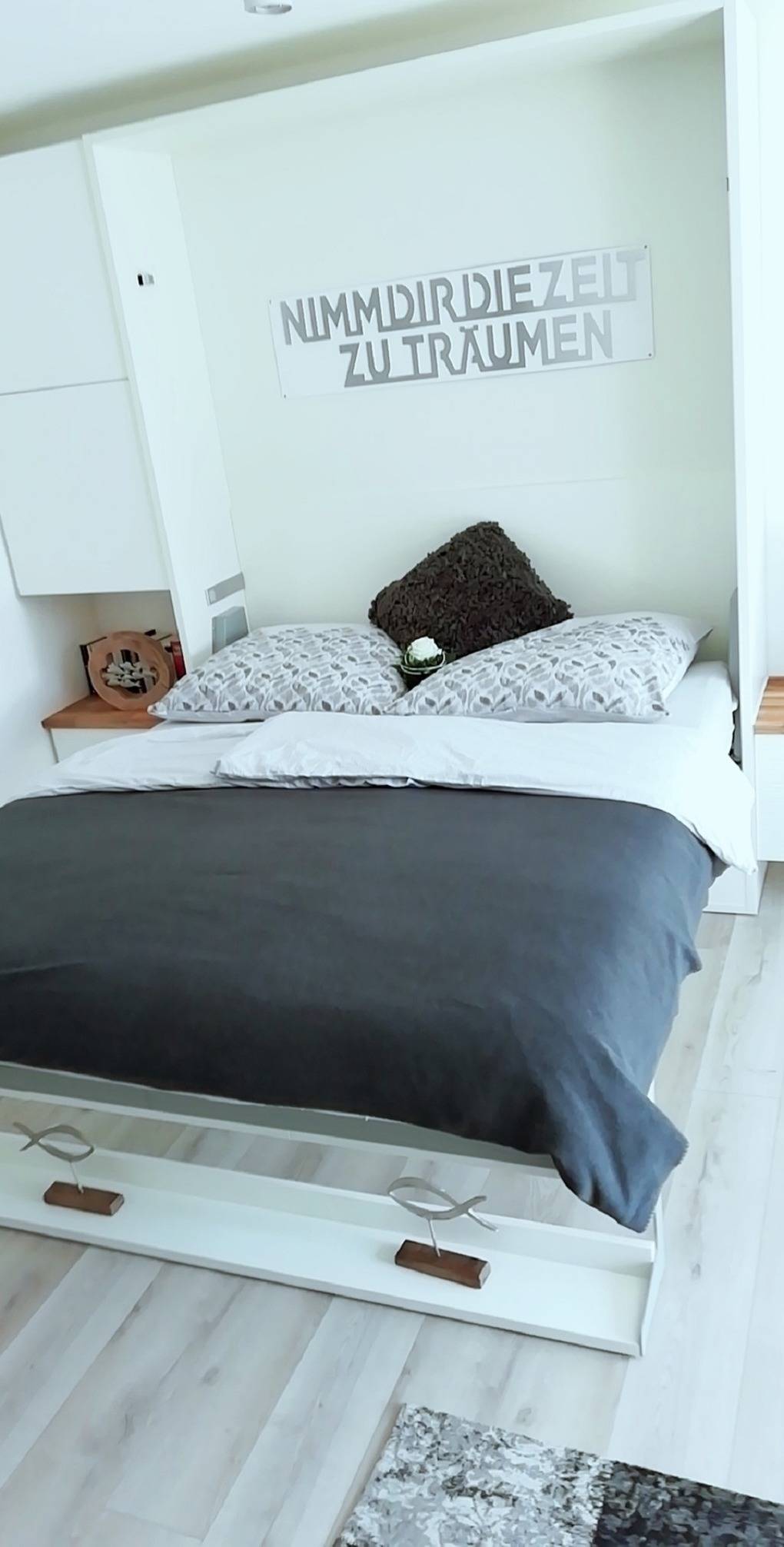Ein komfortables Schrankbett mit einer Liegefläche von 160 x 200 cm sorgt für eine optimierte Platzfreiheit während Ihres Aufenthalts. Zusätzlich kann ein max. 2-jähriges Kind mitreisen