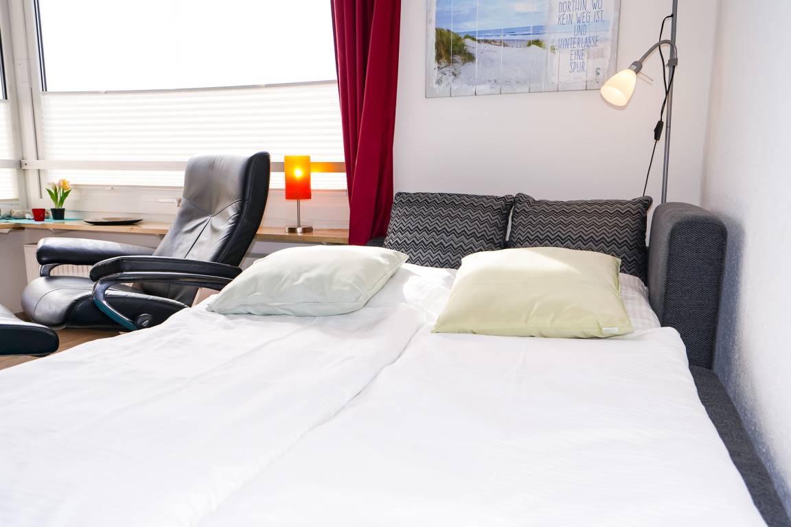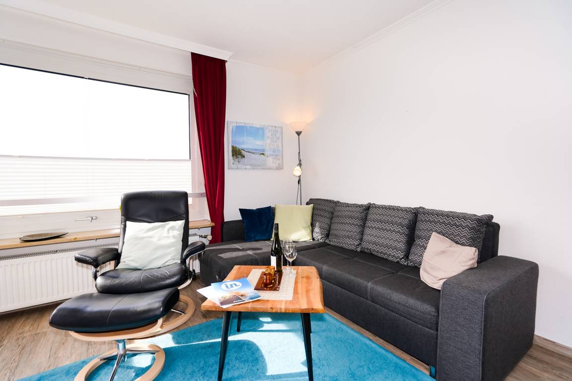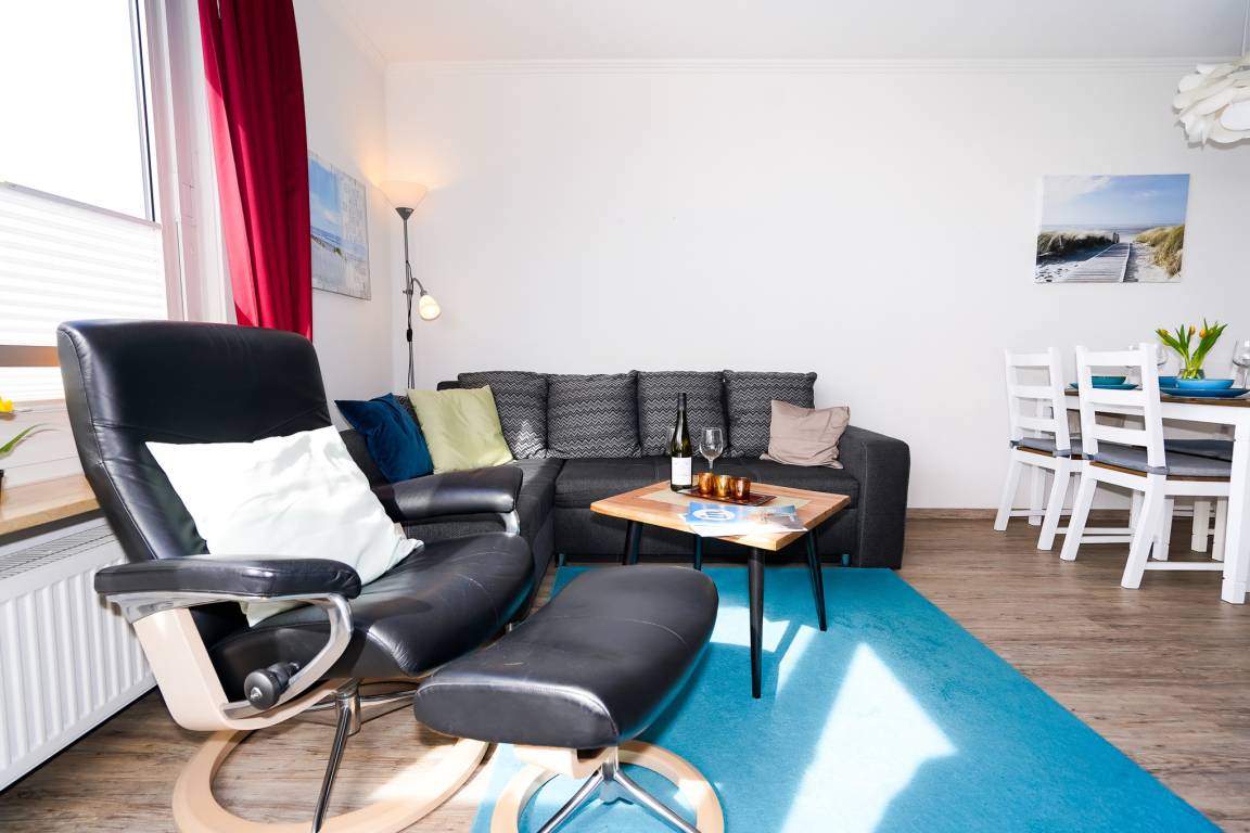 Das lichtdurchflutete Wohnzimmer bietet Ihnen ein bequemes Ecksofa, welches als Schlafcouch (160 x 200) verwendet werden kann. Ein hochwertiger Relaxsessel lädt zum eintspannen ein. Ergänzt wird das Wohnzimmer durch einen großen Fernseher, eine Stereoanlage und einen Esstisch für vier Personen.