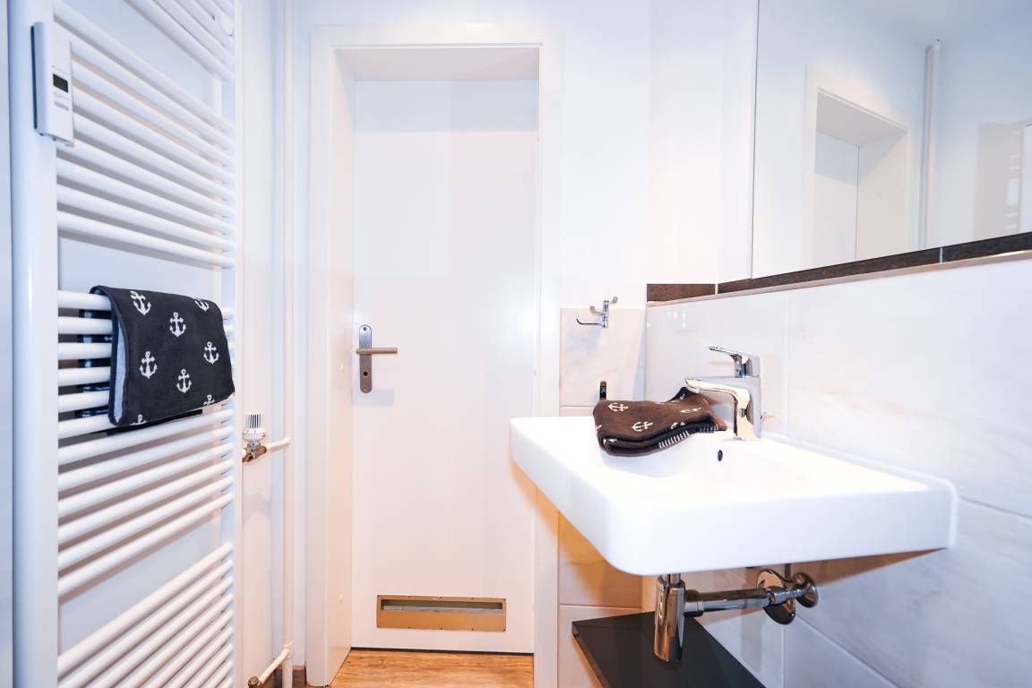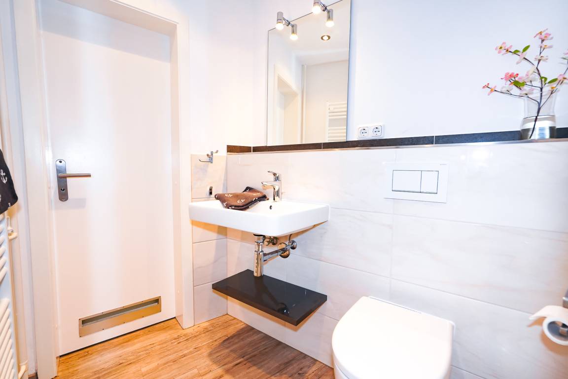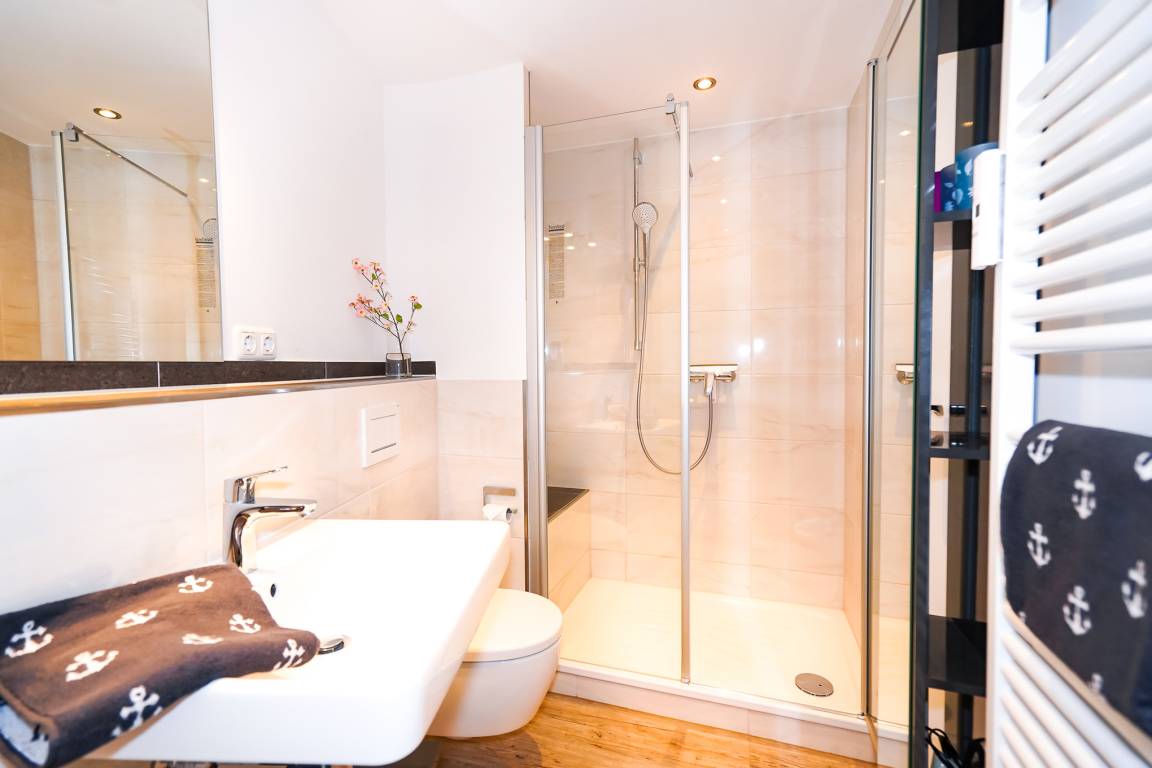 Ein weiteres Highlight ist das modernisierte Badezimmer. Hier erwarten Sie eine große Walk-in Dusche mit Sitzbank, ein Handtuchheizkörper und ein Waschbecken mit Spiegel.