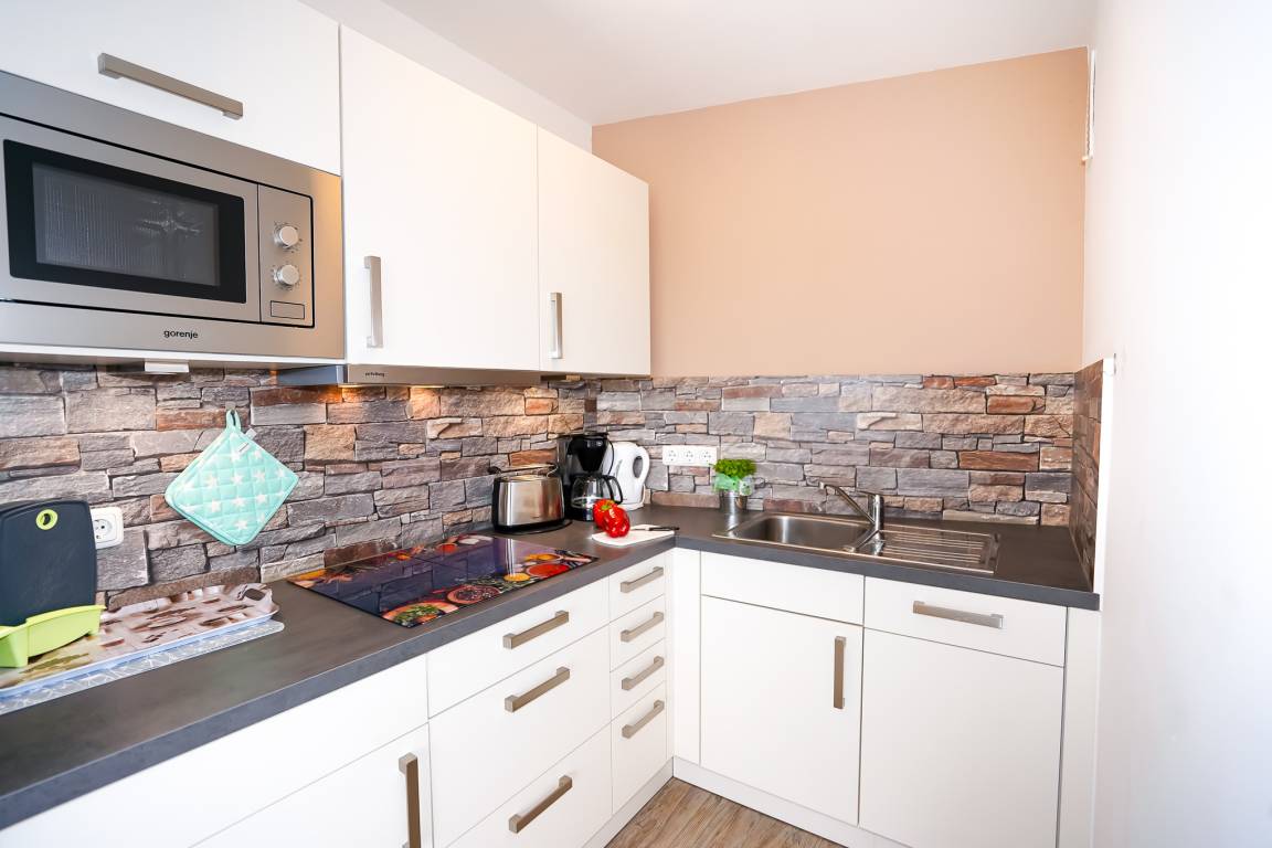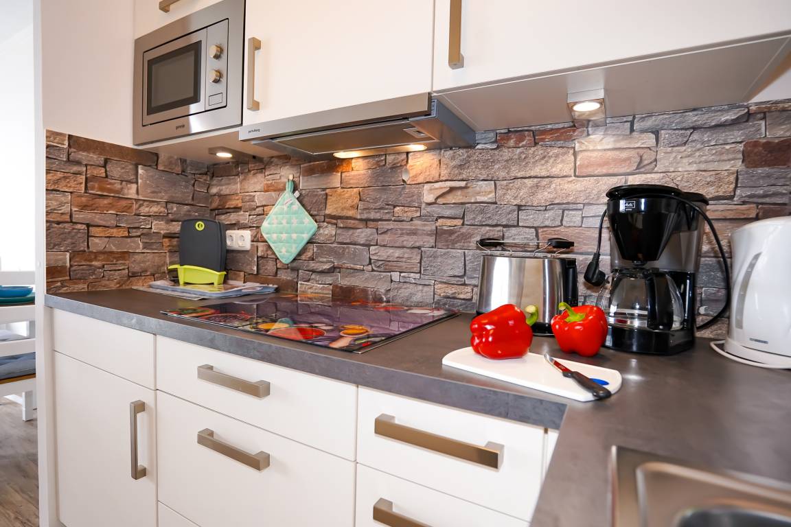 Die offen gestaltete moderne Küche bietet Ihnen ein 4er-Cerankochfeld, Spülmaschine, Kühlschrank mit Gefrierfach, Mikrowelle inklusive Backfunktion und diverse Elektrokleingeräte.