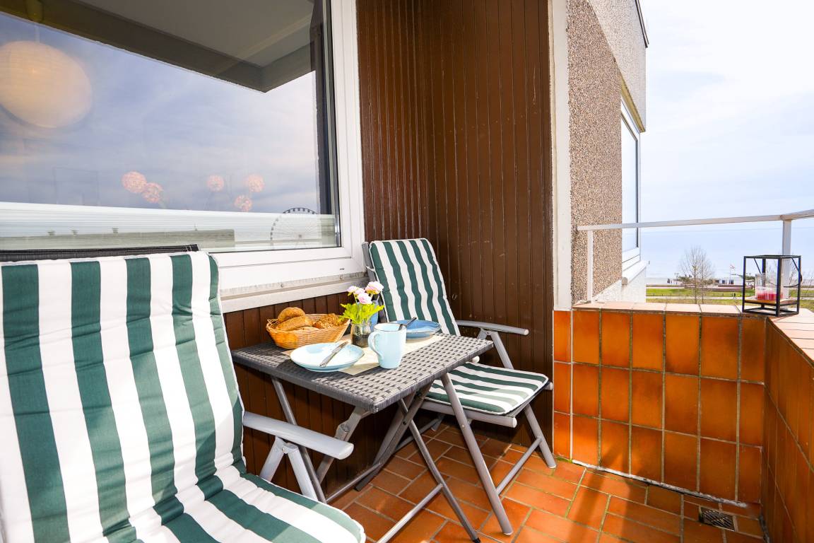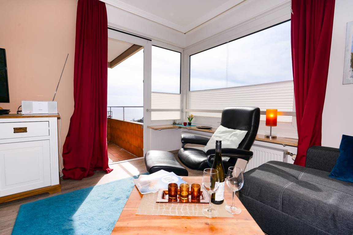Entspannen Sie nach einem Tag am Strand auf Ihrem nach Süd-Westen ausgerichteten Balkon oder auf dem Sofa mit Blick auf die Ostsee durch die großen Fenster.
