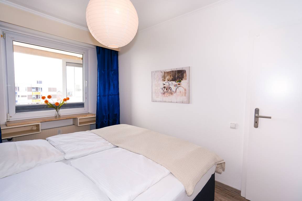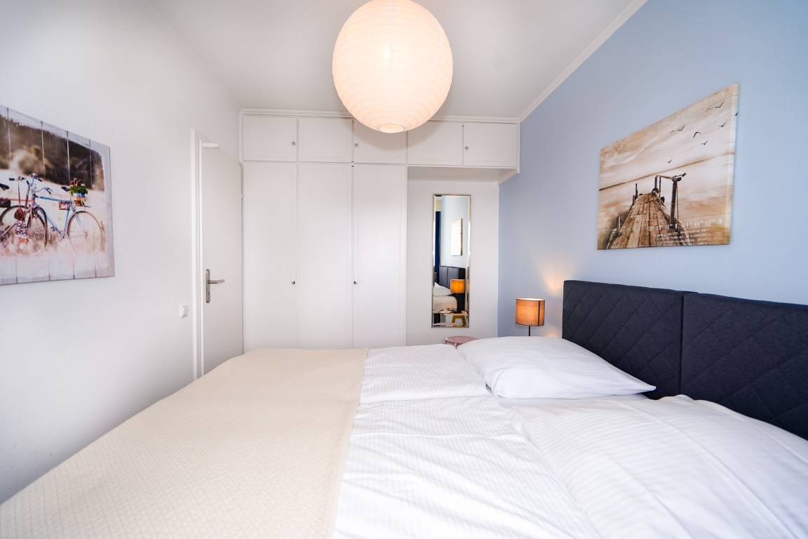 Das Schlafzimmer ist mit zwei bequemen Boxspringbetten(jeweils 90x200) und großzügigen Kleiderschränken ausgestattet. Ein Verdunkelungsplissee sorgt für eine entspannte Nacht.