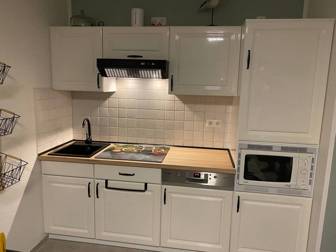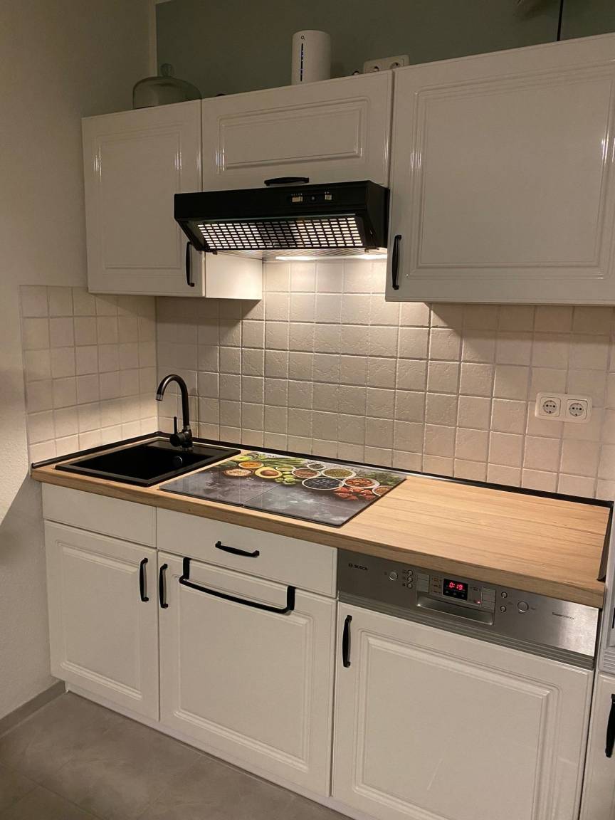 Küchenzeile: Induktionskochfeld, Kühlschrank mit Gefrierfach, Geschirrspüler, Kaffeemaschine, Wasserkocher, Toaster, Kindergeschirr/Hochstuhl, Mikrowelle mit Grill