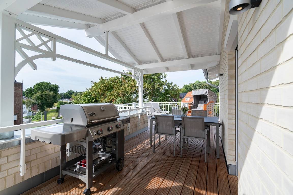Parken Sie Ihren PKW bequem auf dem vorhandenen Stellplatz und fahren Sie mit dem Fahrstuhl exklusiv und direkt in Ihre Ferienoase im 3. Obergeschoss. Treten Sie ein und genießen Sie das Ostseegefühl von Ruhe und Entspannung. Der lichtdurchflutete Wohnraum mit moderner Sofagarnitur mit Schlaffunktion und TV grenzt an die offene, elegante Küche. Ausgestattet mit Backofen, Herd, Kühlschrank mit Gefrierfach, Kaffeemaschine, Spülmaschine etc. wird es Ihnen an nichts fehlen. Von hier haben Sie Zutritt zu der beeindruckenden Dachterrasse mit Blick über die Dächer von Grömitz und in den idyllischen Kurpark. Verbringen Sie hier gemütliche Grillabende und bereiten Sie sich Ihr Grillgut auf dem vorhandenen Webergrill zu. Bei einem ausgiebigen Frühstück können Sie die ersten Sonnenstrahlen und die Ostseeluft genießen und voller Energie in den Urlaubstag starten. Hochwertige Gartenmöbel, Sonnenliegen, komfortable Lounge-Möbel sowie ein Strandkorb stehen für Sie bereit. Ein Sonnenschirm spendet bei Bedarf den nötigen Schatten.