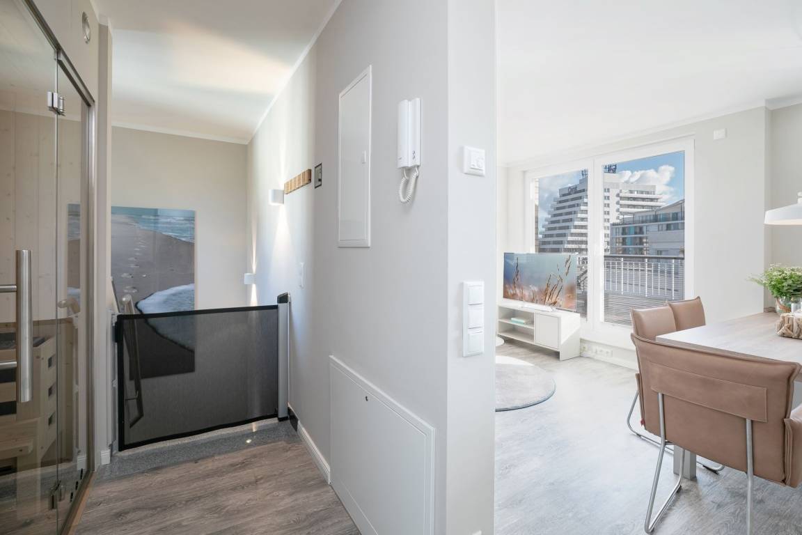 Aber nicht nur im Sommer ist diese Ferienoase unschlagbar. Ein Kamin und eine Sauna sorgen auch an kühleren Tagen für Gemütlichkeit und Erholung. Nach ereignisreichen Ausflügen an der Lübecker Bucht können Sie in einem der beiden separaten Schlafräume zur Ruhe kommen. Diese sind mit jeweils 200x200 cm Boxspringbetten ausgestattet. In einem Schlafzimmer ist genügend Platz für ein Babybett oder sogar ein Zustellbett. Von einem Schlafzimmer haben Sie einen herrlichen Blick in den Kurpark und vom anderen Schlafzimmer einen eigenen Zugang zur Dachterrasse. Beide Zimmer verfügen über einen Smart TV. Luxuriös und hell komplettiert das großzügige Badezimmer mit bodentiefer Dusche, beheizbarem Handtuchhalter und Spiegel mit Bluetooth-Boxen dieses Ostseedomizil. In dieser Wohnung wurde an Nichts gespart, genießen Sie hier Ihre wohlverdiente Auszeit in luxuriösem Stil als Familie oder auch romantisch zu zweit. Alle Smart-TV-Geräte in diesem Feriendomizil sind mit Streaming-Apps, wie Netflix, Amazon Prime etc. ausgestattet und können mit Ihren privaten Accounts genutzt werden. Via Bluetooth empfangen Sie Internet-Radio und genießen den Sound über das Bose SoundTouch Serie 20 III-System. Im ganzen Ferienobjekt bietet ein Fußbodenheizung angenehme Wärme.