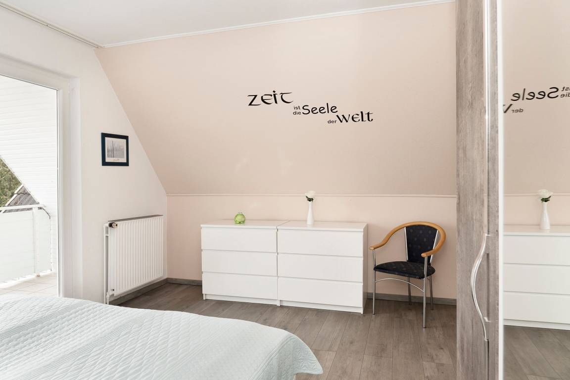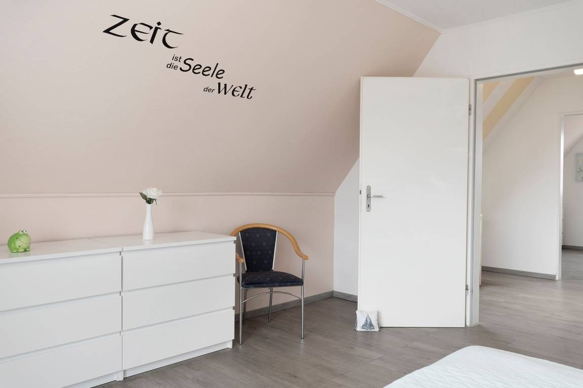 Schlafzimmer 1 im OG: 1 Doppelbett (2 x90x200cm), Kleiderschrank, Verdunkelung: Plissee, Platz für Babybett vorhanden