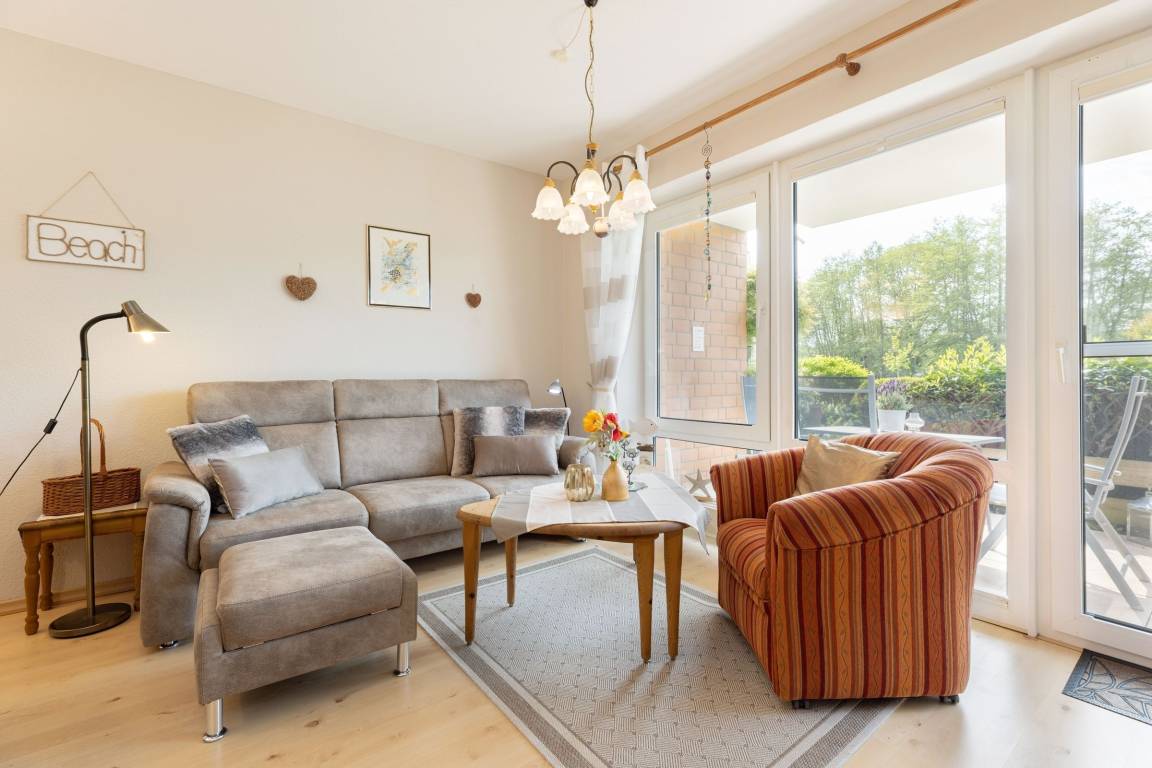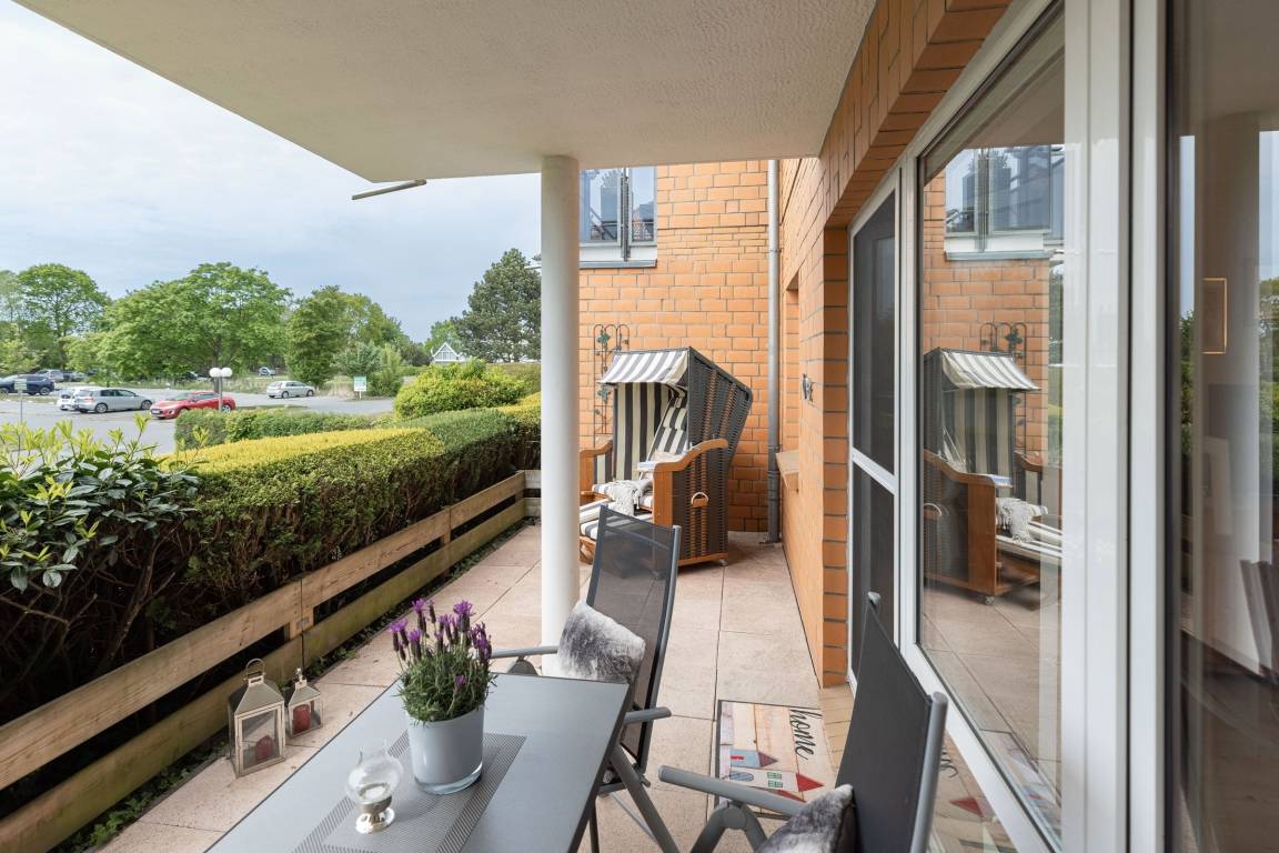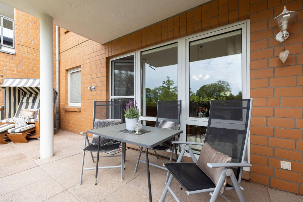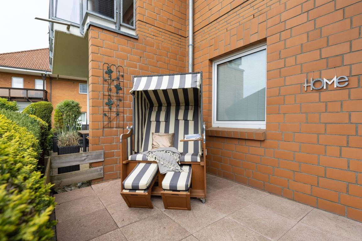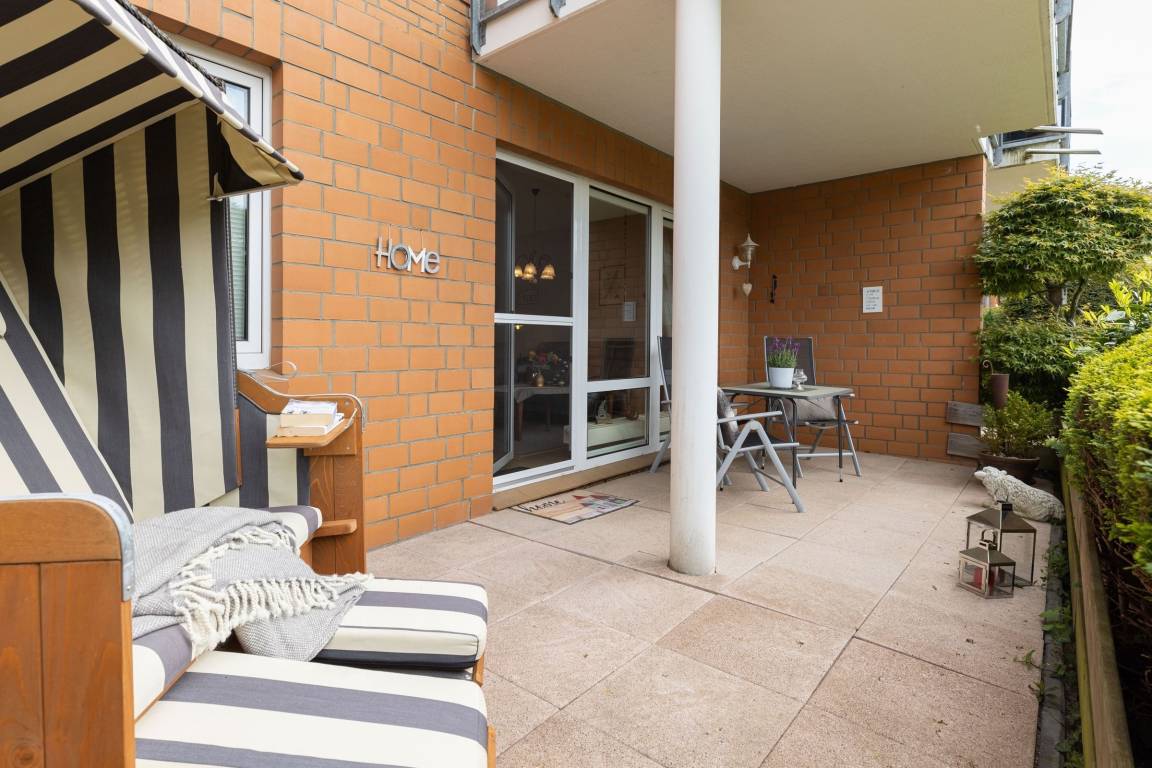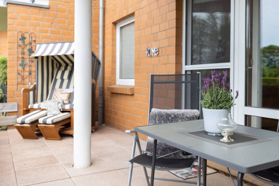 Vom Wohnzimmer gelangen Sie auf Ihre eingezäunte und grün umsäumte, möblierte Terrasse. Dort lassen sich selbst bei Regen die lauen Abende gemütlich im Strandkorb genießen, denn die Terrasse ist anteilig überdacht. Die kleine, aber feine Küche ist separat und mit Alltagshelfern wie Ceranherd, Kühlschrank mit Gefrierfach und Kaffeemaschine solide ausstaffiert. Die Ferienwohnung ist mit zwei Bädern ausgestattet: Einem Vollbad mit Badewanne sowie einem Gäste-WC.