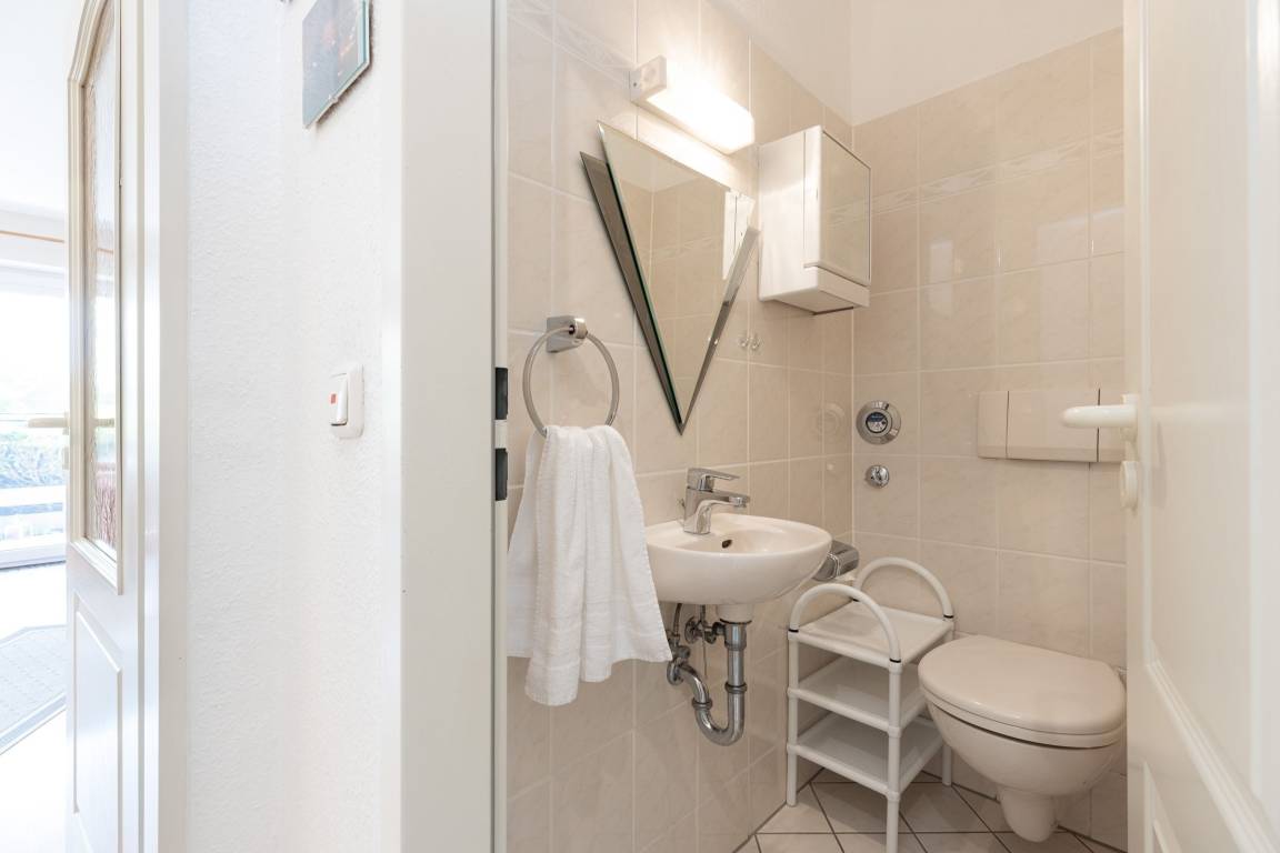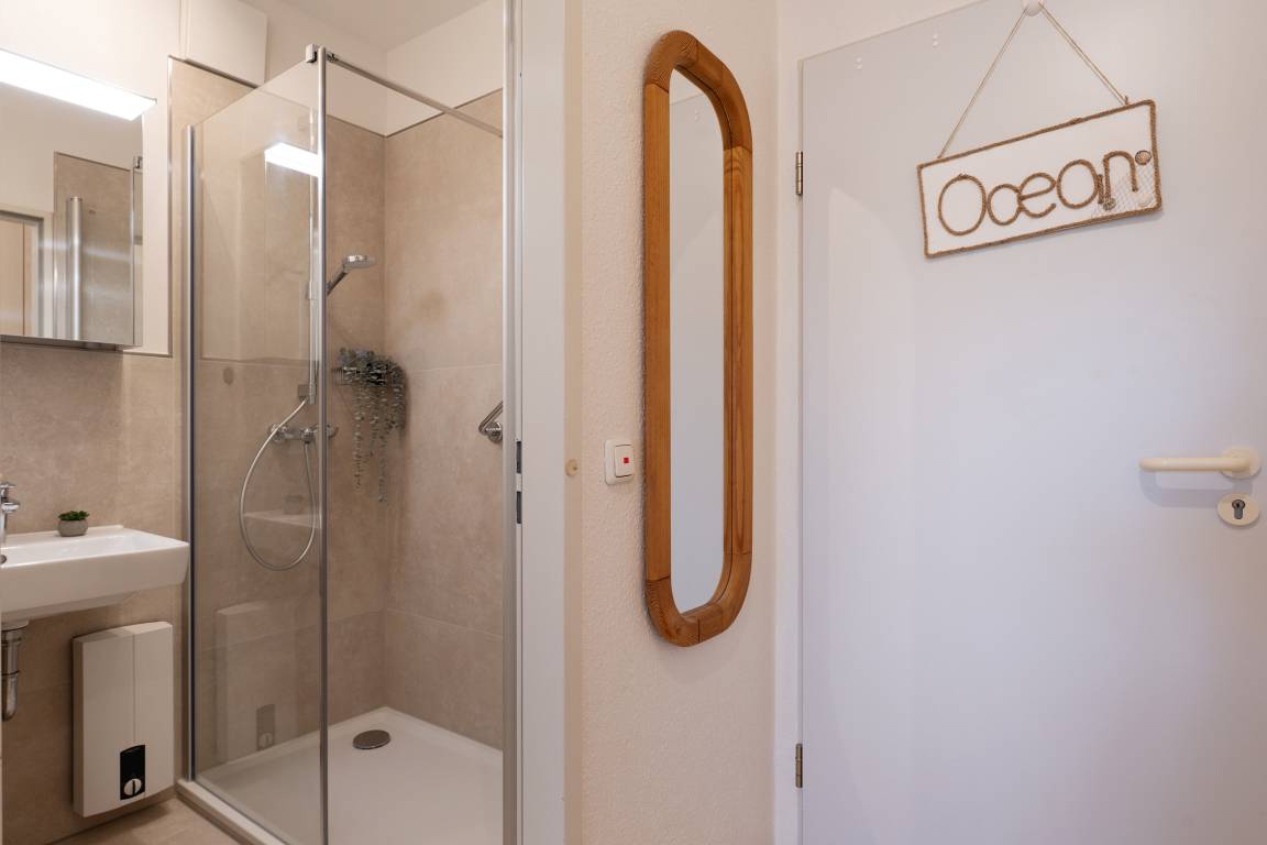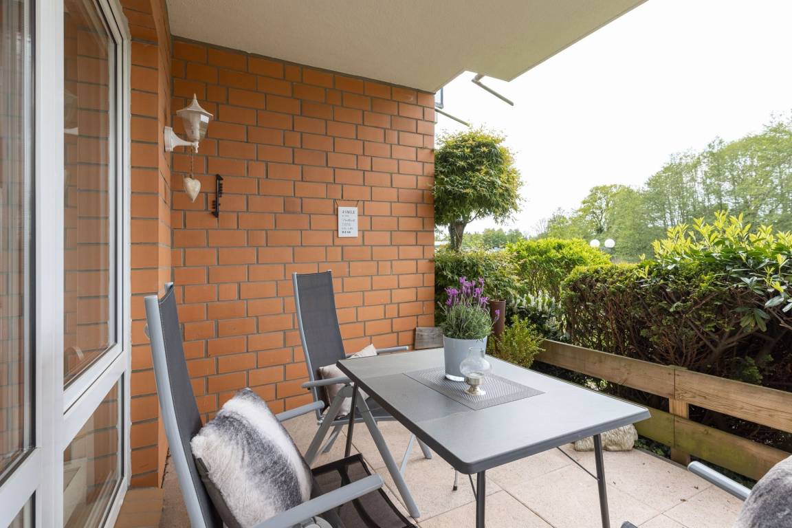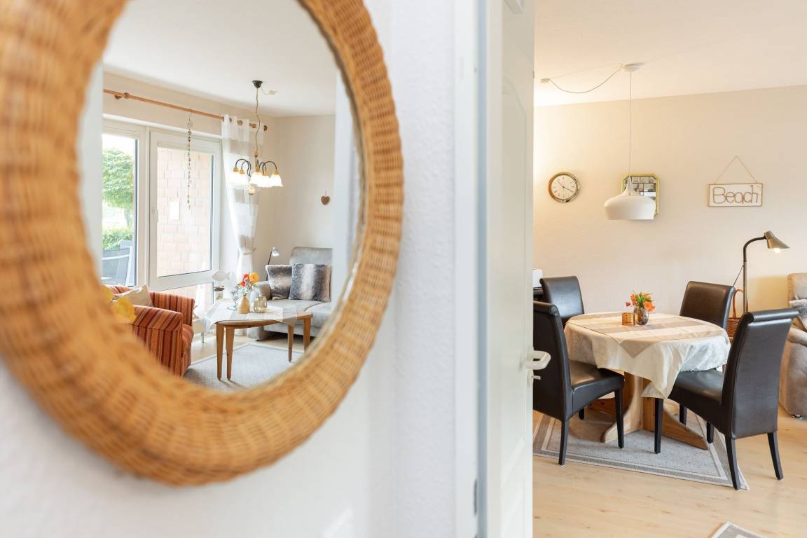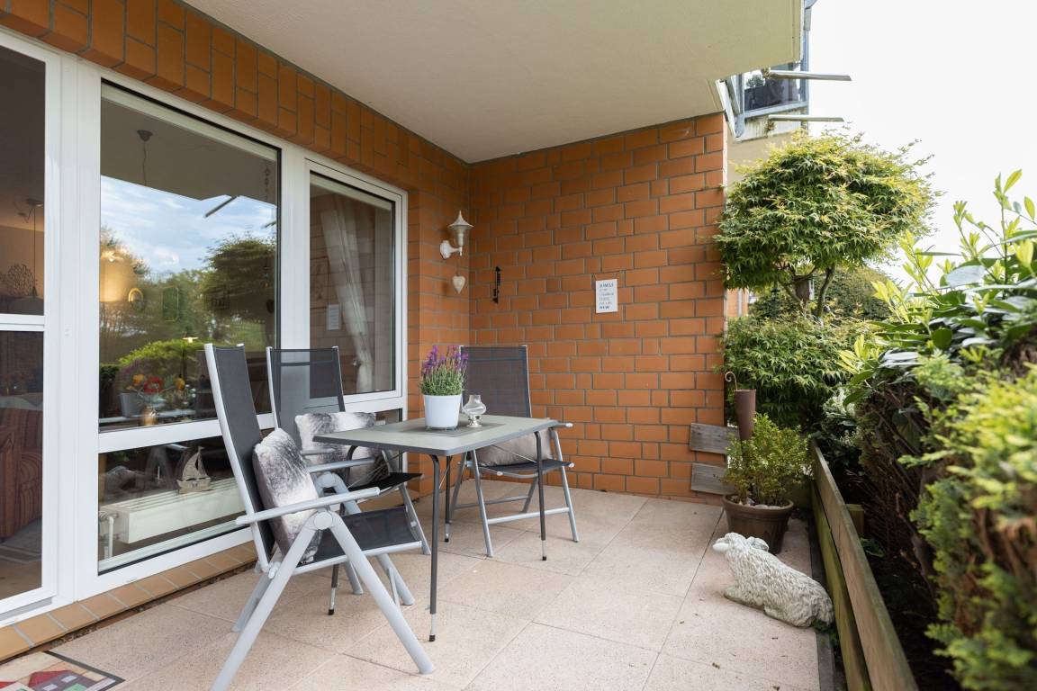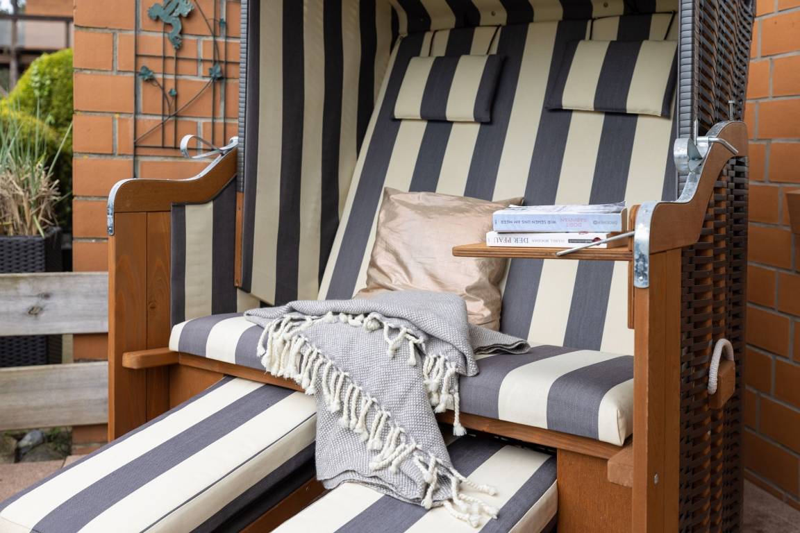 Vom Wohnzimmer gelangen Sie auf Ihre eingezäunte und grün umsäumte, möblierte Terrasse. Dort lassen sich selbst bei Regen die lauen Abende gemütlich im Strandkorb genießen, denn die Terrasse ist anteilig überdacht. Die kleine, aber feine Küche ist separat und mit Alltagshelfern wie Ceranherd, Kühlschrank mit Gefrierfach und Kaffeemaschine solide ausstaffiert. Die Ferienwohnung ist mit zwei Bädern ausgestattet: Einem Vollbad mit Badewanne sowie einem Gäste-WC.