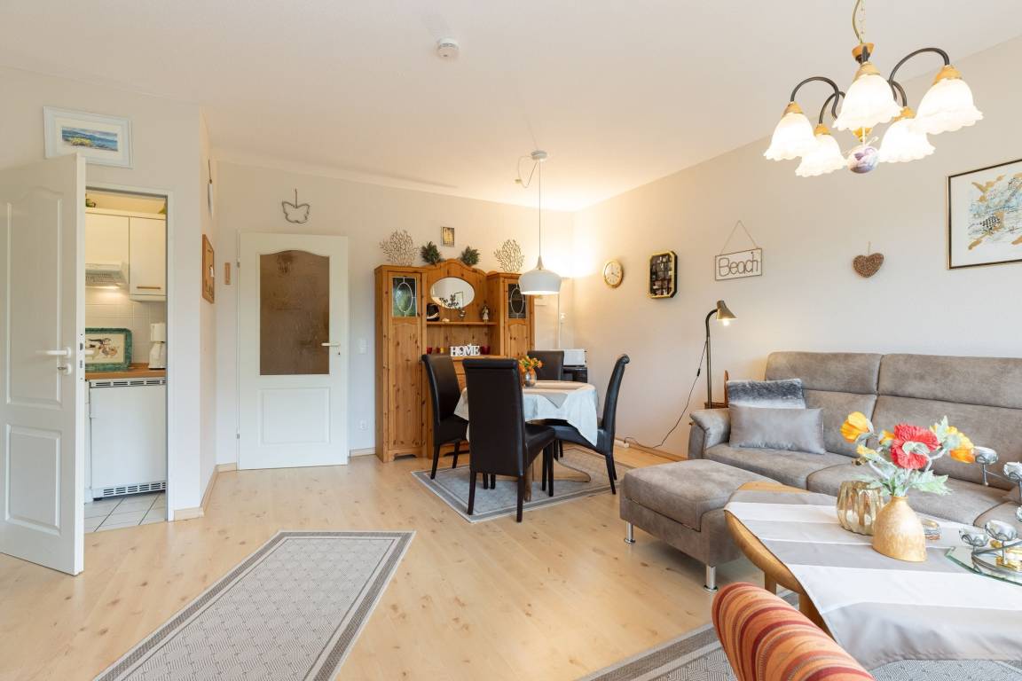 Durch den Flur betreten Sie das Wohnzimmer, welches mit einem Sofa (Liegefläche 85x185cm) und Sesseln sowie einem Essplatz für bis zu 4 Personen behaglich eingerichtet ist. Für Unterhaltung sorgen z. B. ein Flachbildfernseher und ein kostenfreier WLAN-Anschluss.