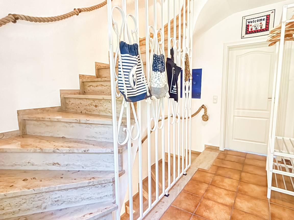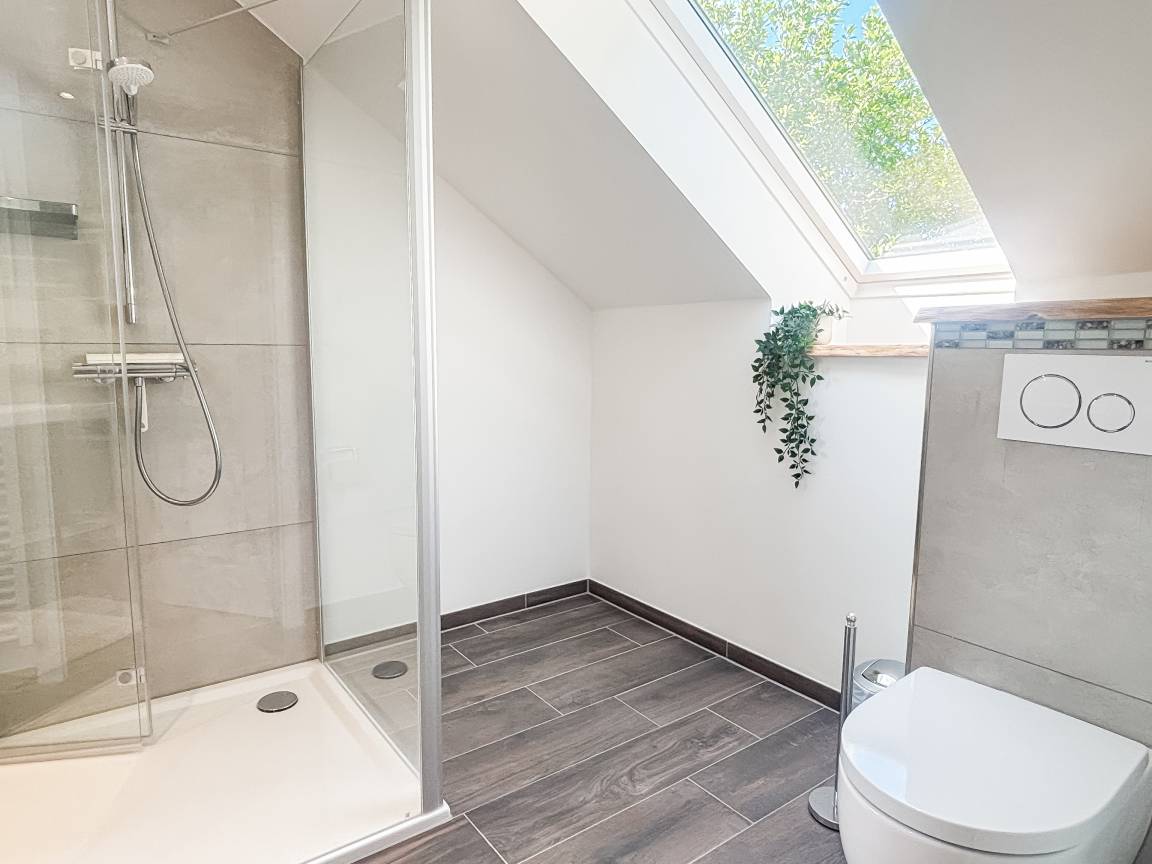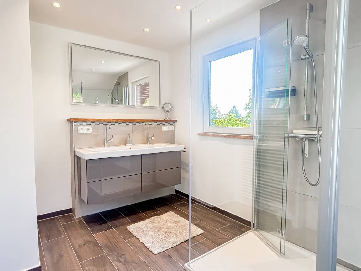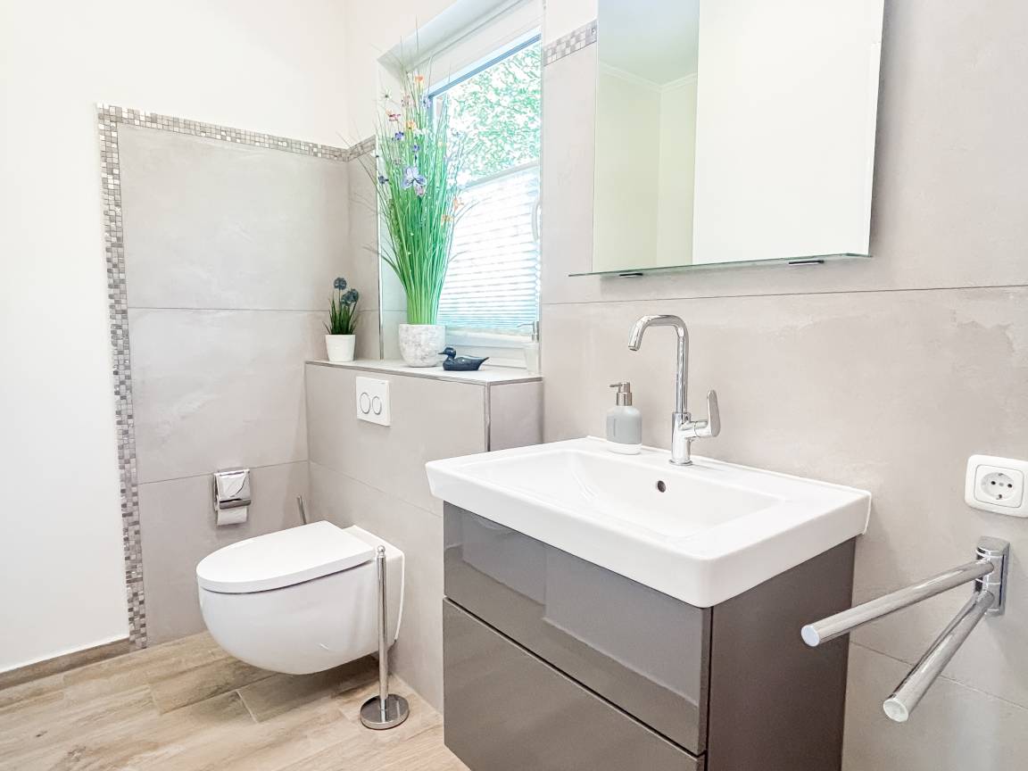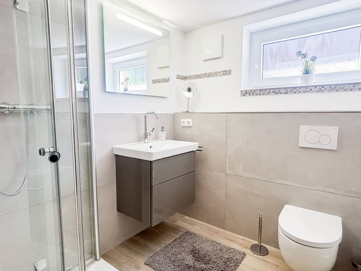 Jede Etage verfügt über ein Bad mit Dusche, außer dem Erdgeschoss, dort befindet sich nur ein Gäste- WC mit Waschmaschine.