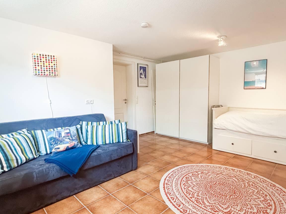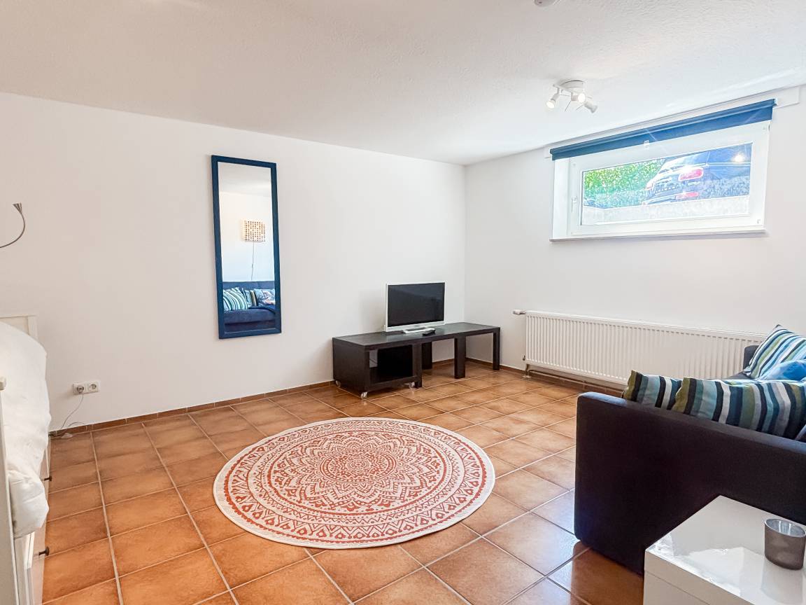 Das 2. Schlafzimmer mit zwei Schlafsofas für je 2 Personen, Kleiderschrank, TV, Sessel liegt im Souterrain mit Oberlichtfenster.