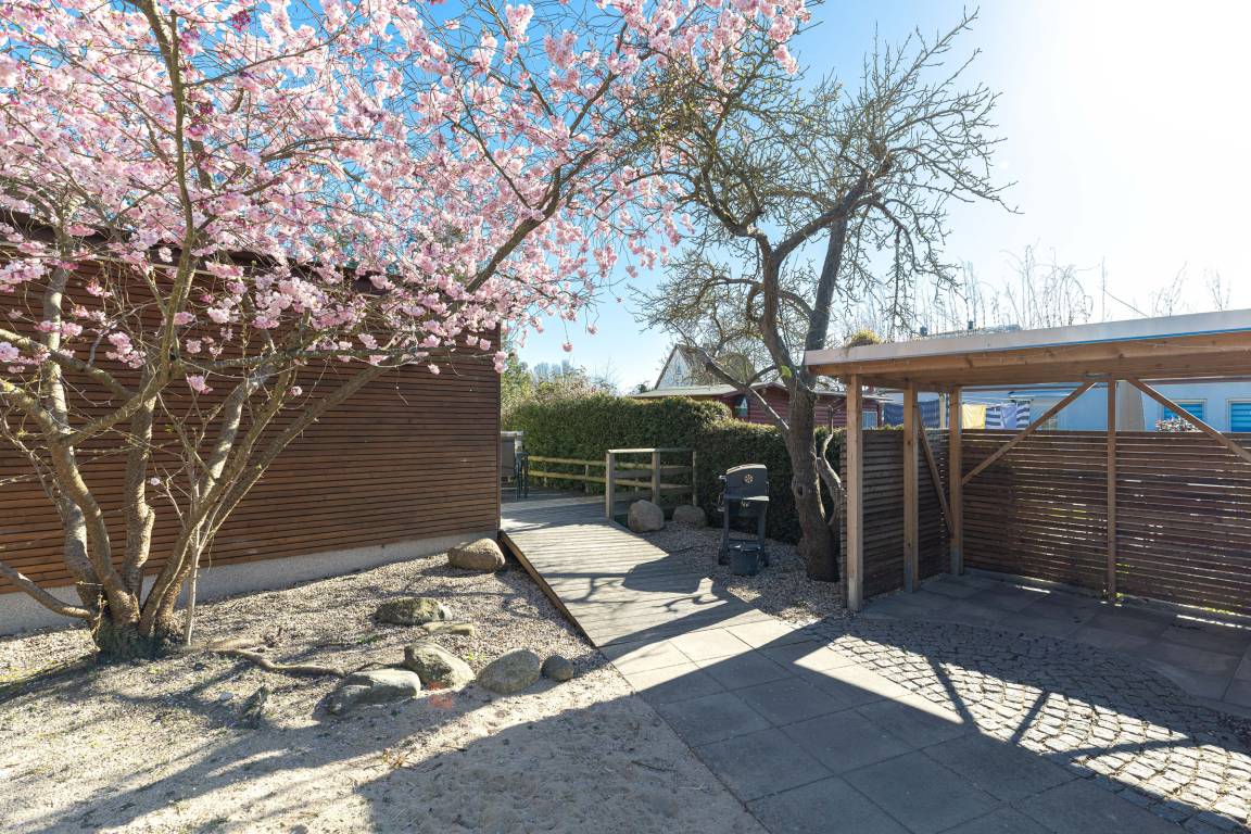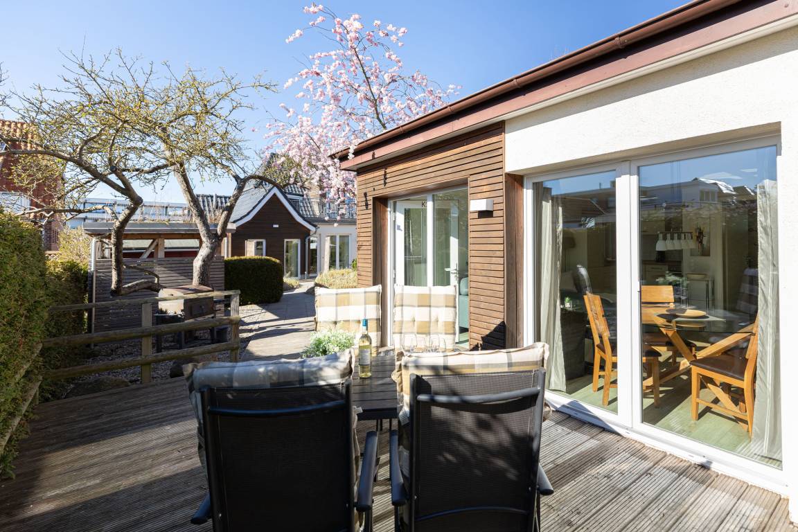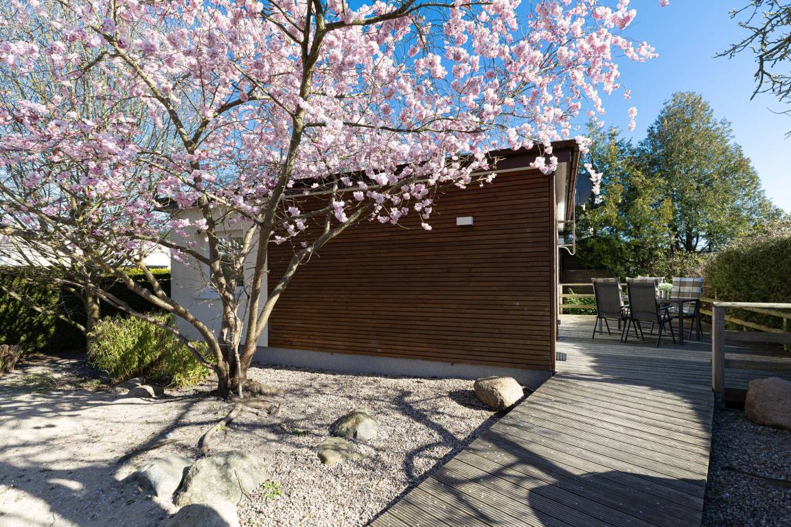 Über die barrierefreie Zuwegung, vom Parkplatz, durch den Garten, über die große Holzterrasse, bis zur Eingangstür, betreten Sie den ansprechenden, hellen Wohnraum dieses Bungalows der Extraklasse. Es empfangen Sie Urlaubsfreude und Bestätigung, das richtige Quartier gewählt zu haben. Ganz ungestört, im hinteren Teil des Gartens genießen Sie Wohnqualität in diesem modernen Ferienhäuschen.