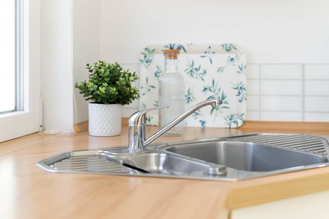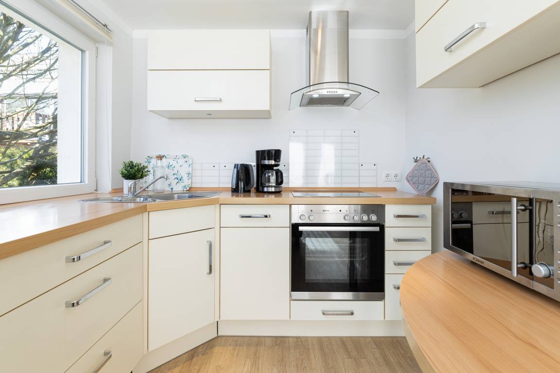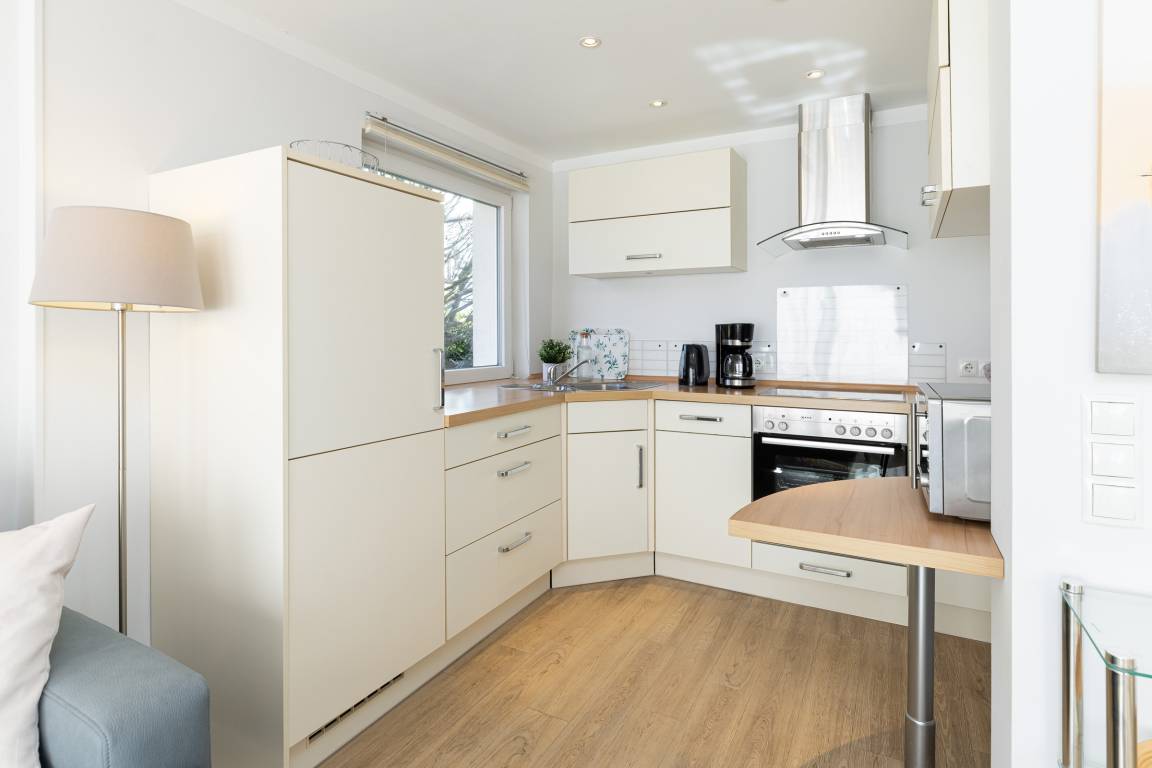 Im hinteren Teil des offenen Wohnraums befindet sich die moderne Winkelküche mit allem Komfort (Geschirrspüler, 3-Sterne-Kühlschrank mit Gefrierfach und Herd mit Ceran-Kochfeld).