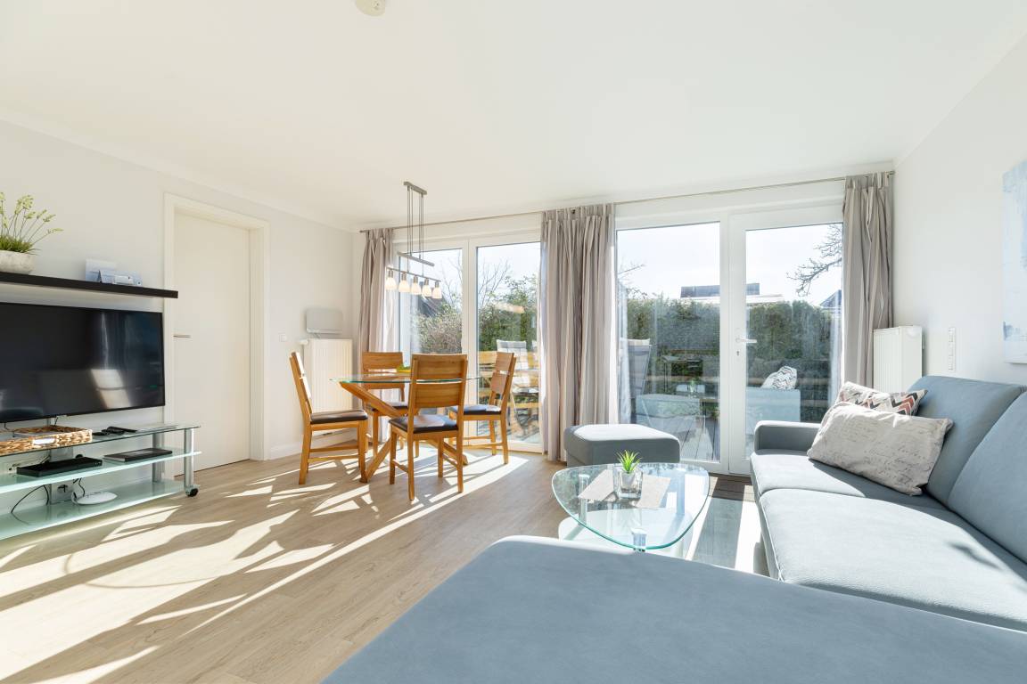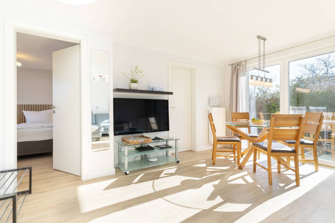 Kunststoff-Design-Fußboden in Sandfarbe und helle Wände zeugen von Sauberkeit und Hygiene. Die Viermeter-Fensterfront zur Süd-Westseite versorgt den großzügigen Wohnraum mit viel Licht und garantiert freundliche Helligkeit. Direkt davor finden Sie die moderne Esstischgruppe mit wertigen Massivholz-Stühlen.