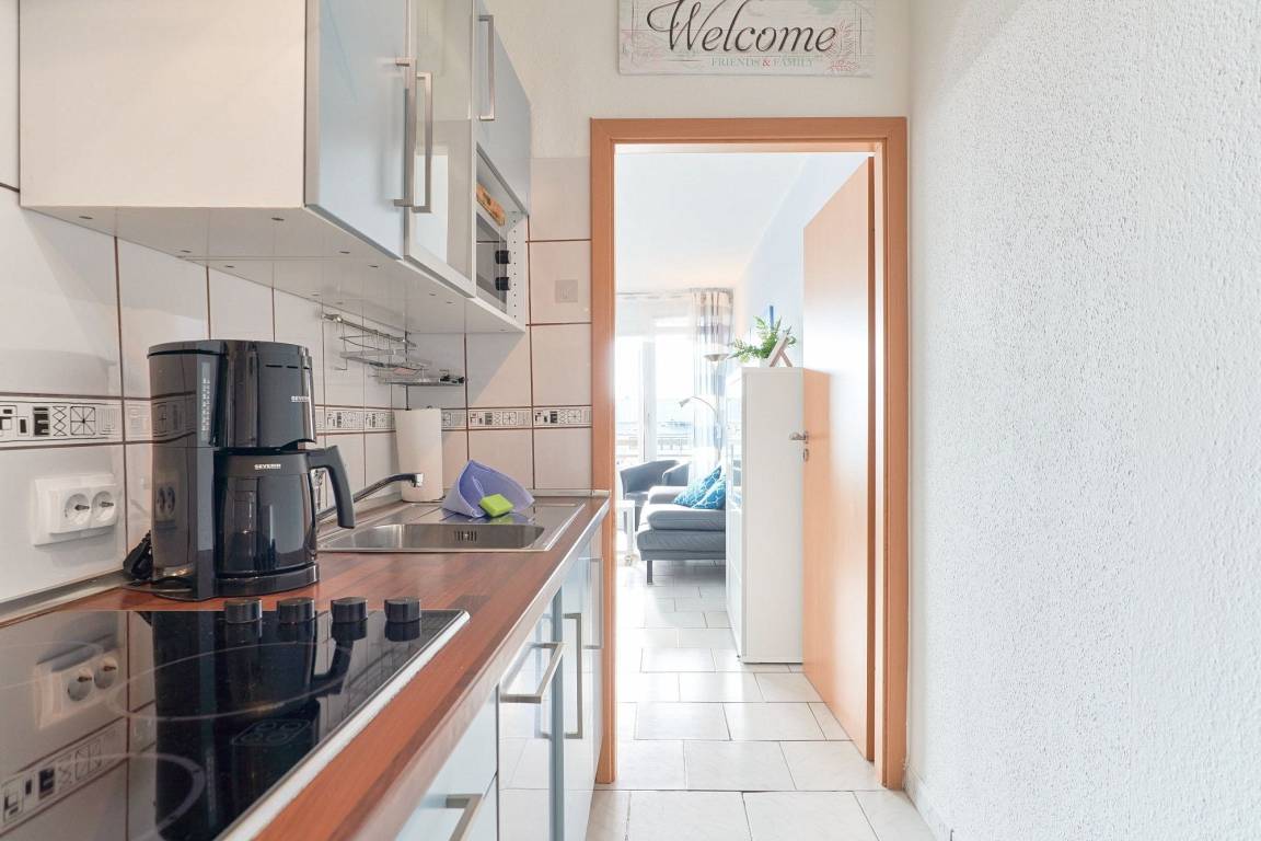 Komplett ausgestattete Küchenzeile mit 4 Platten Cerankochfeld, Spülmaschine, Backofen, Kühlschrank mit kleinem 3-Sterne Gefrierfach, Mikrowelle, Toaster, Wasserkocher, Kaffeemaschine.