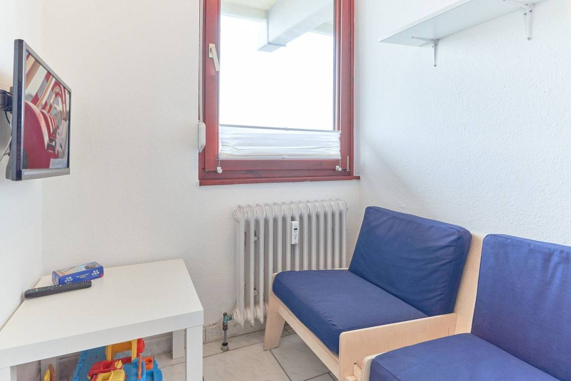 Großer Wohn-/Schlafbereich mit direktem Zugang zum Balkon. Der Raum verfügt über ein Schrankbett (2x80x200cm), eine kleine Couch, 2 Sessel sowie einen Essplatz für 4 Personen. Zur Unterhaltung stehen ein Flachbildfernseher sowie eine Stereoanlage mit CD-Player zur Verfügung. Der Boden ist gefliest und die Fenster lassen sich durch Innenjalousien verdunkeln.