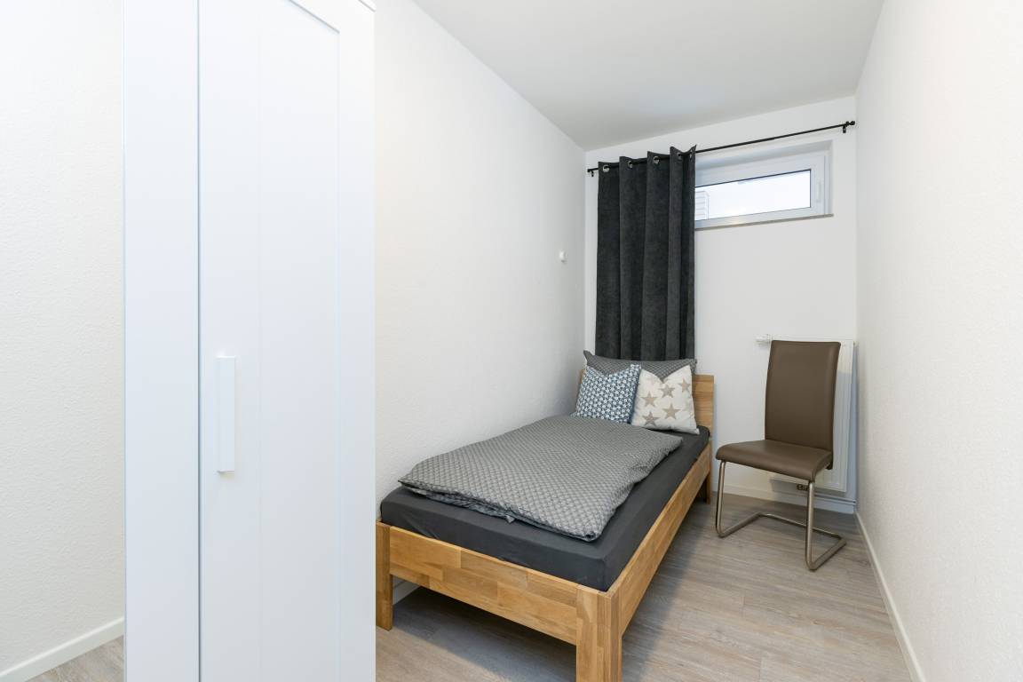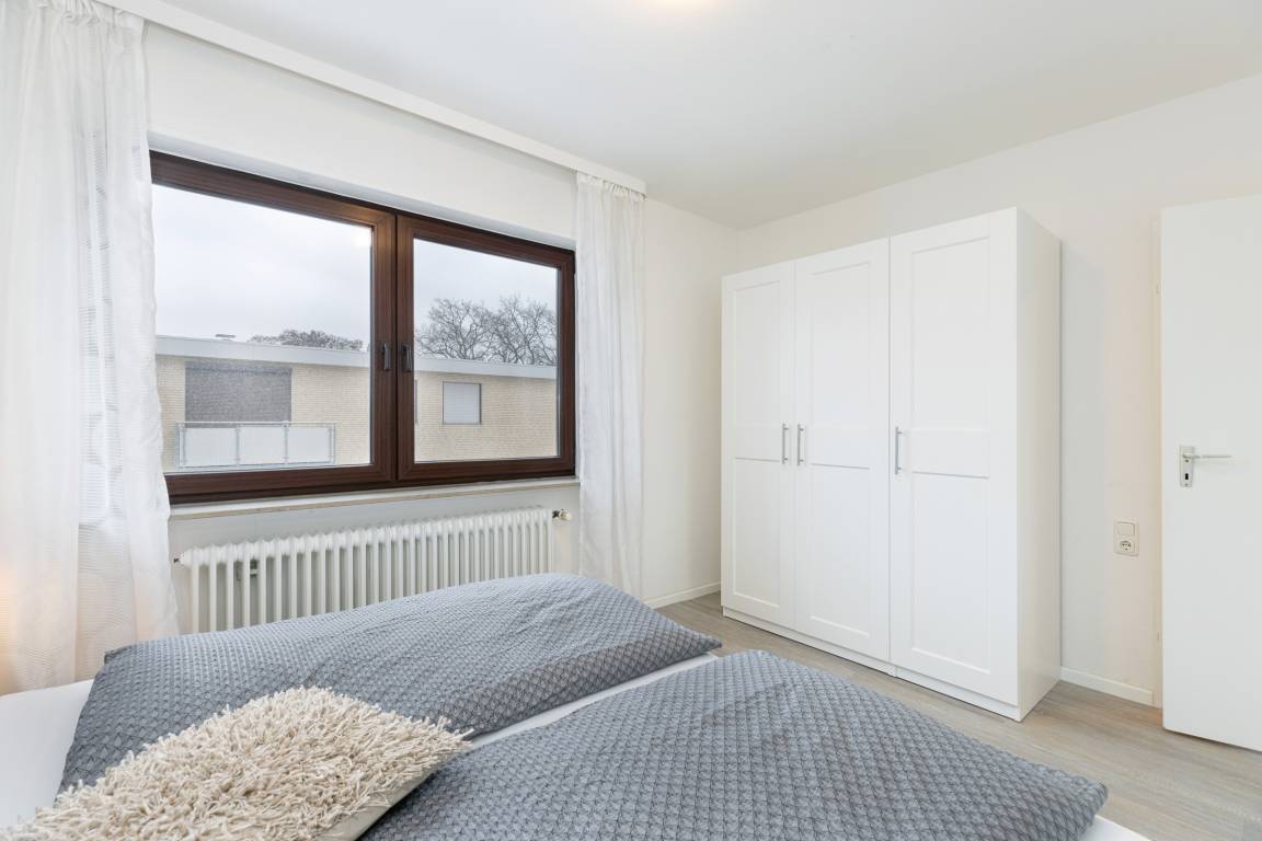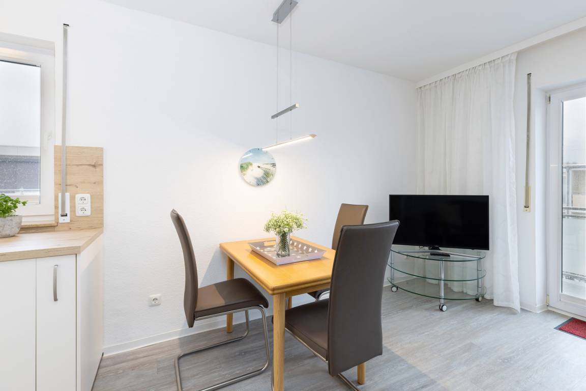 Die Unterkunft bietet 1 Schlafzimmer mit Doppelbett (180x200 cm) und einen Schlafraum mit Einzelbett (90x200 cm). Außerdem kannst du dich im Wohnzimmer mit Essbereich und angeschlossener Winkelküche wohlfühlen. Die großen Fenster lassen viel Tageslicht hinein.