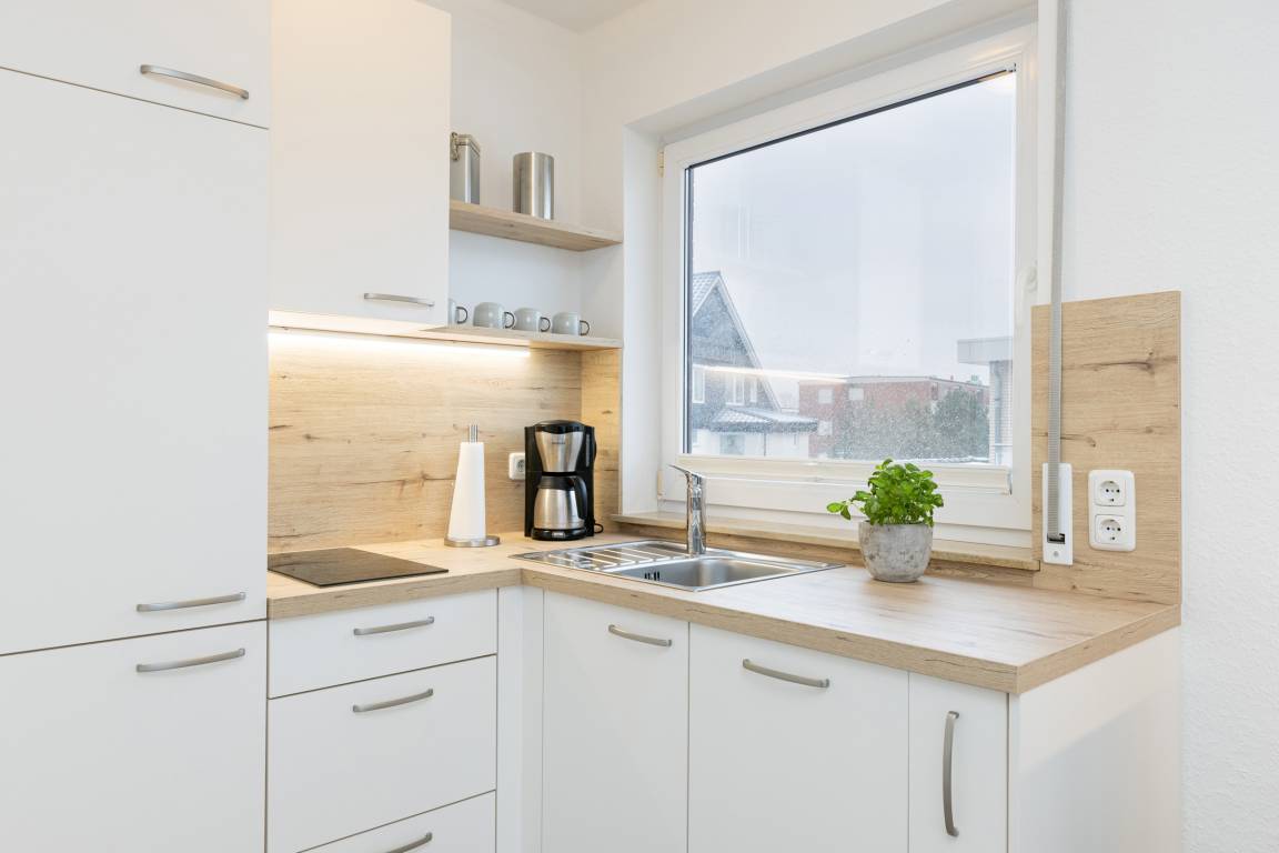 Die Küche ist neben einem Kühlschrank mit Eisfach auch mit einer Mikrowelle, einem Ceran-Kochfeld, einer Filterkaffeemaschine und einem Wasserkocher ausgestattet.