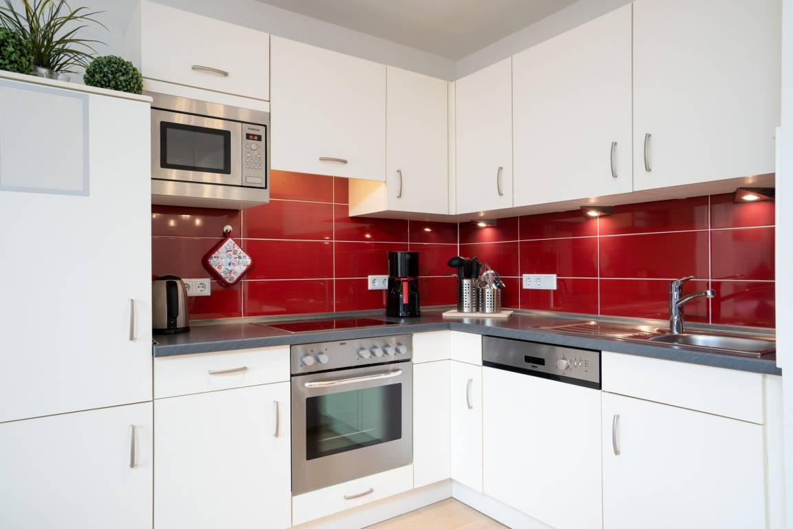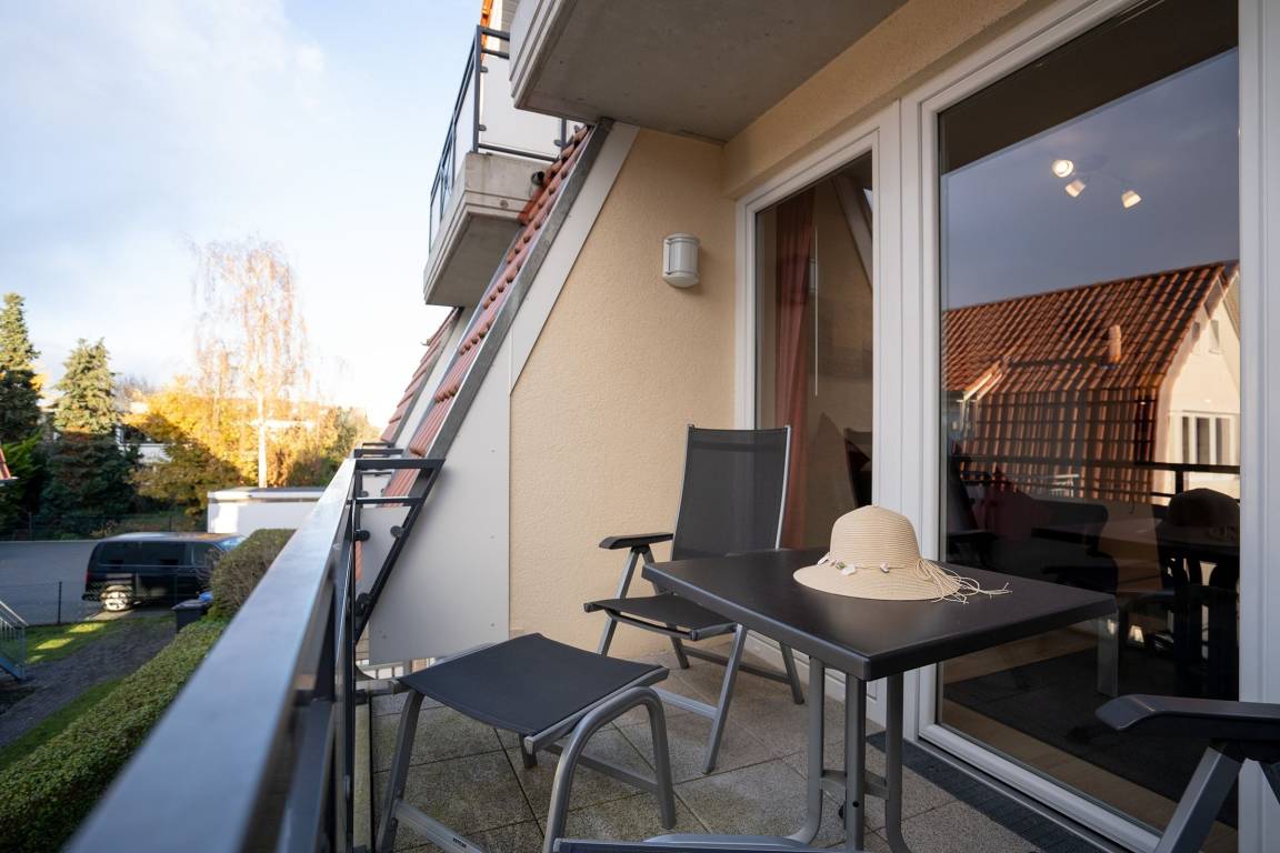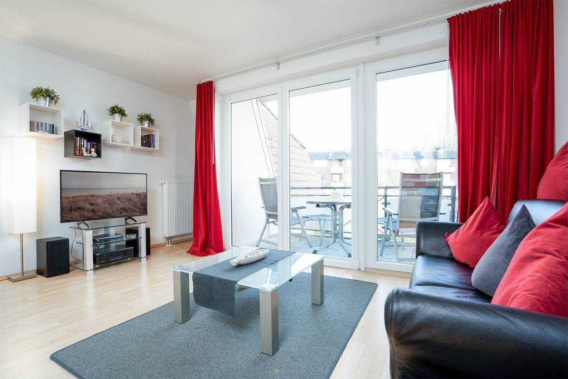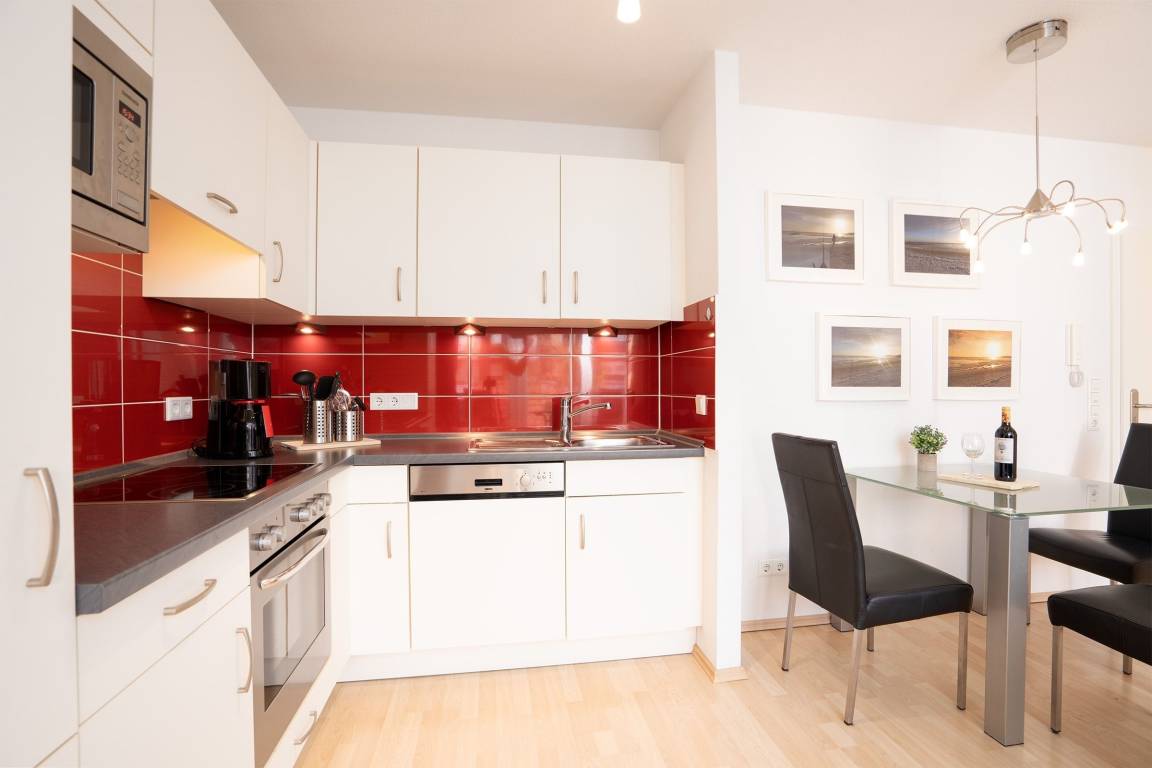 Die Wohnung liegt in der 1. Etage eines gepflegten Mehr-Appartement-Haus mit Fahrstuhl und verfügt über 2 schwellenlose Zimmer. Gemütlich eingerichtet und hochwertig möbliert lassen sich hier die wohlverdienten Urlaubstage komfortabel verbringen. Das Wohnzimmer ist ausgestattet mit einer Couch- und Essecke sowie einer offenen Küche, in der einem gemütlichen Kochabend nichts entgegensteht. Die Couch verfügt über eine Schlaffunktion (150x210 cm) und bietet somit Platz für einen 3. Urlaubsgast. Der Balkon zur Westseite (kleine Schwelle) lädt zum morgendlichen Frühstück ein, der Bäcker mit frischen Brötchen ist direkt um die Ecke. Im separaten Schlafzimmer erwartet Sie ein großes Doppelbett (160x200 cm) in dem Sie Ihren Urlaub erholsam genießen können. Ein Bad mit ebenerdiger Dusche sowie ein WC und ein Waschbecken rundet dieses Feriendomizil ab.