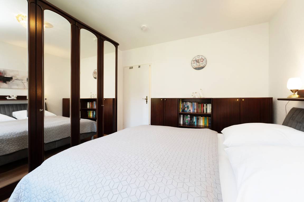 Schlafzimmer: 1 Doppelbett (2x 90x200 cm), Kleiderschrank, Verdunkelung: Rollo, Platz für ein Babybett vorhanden