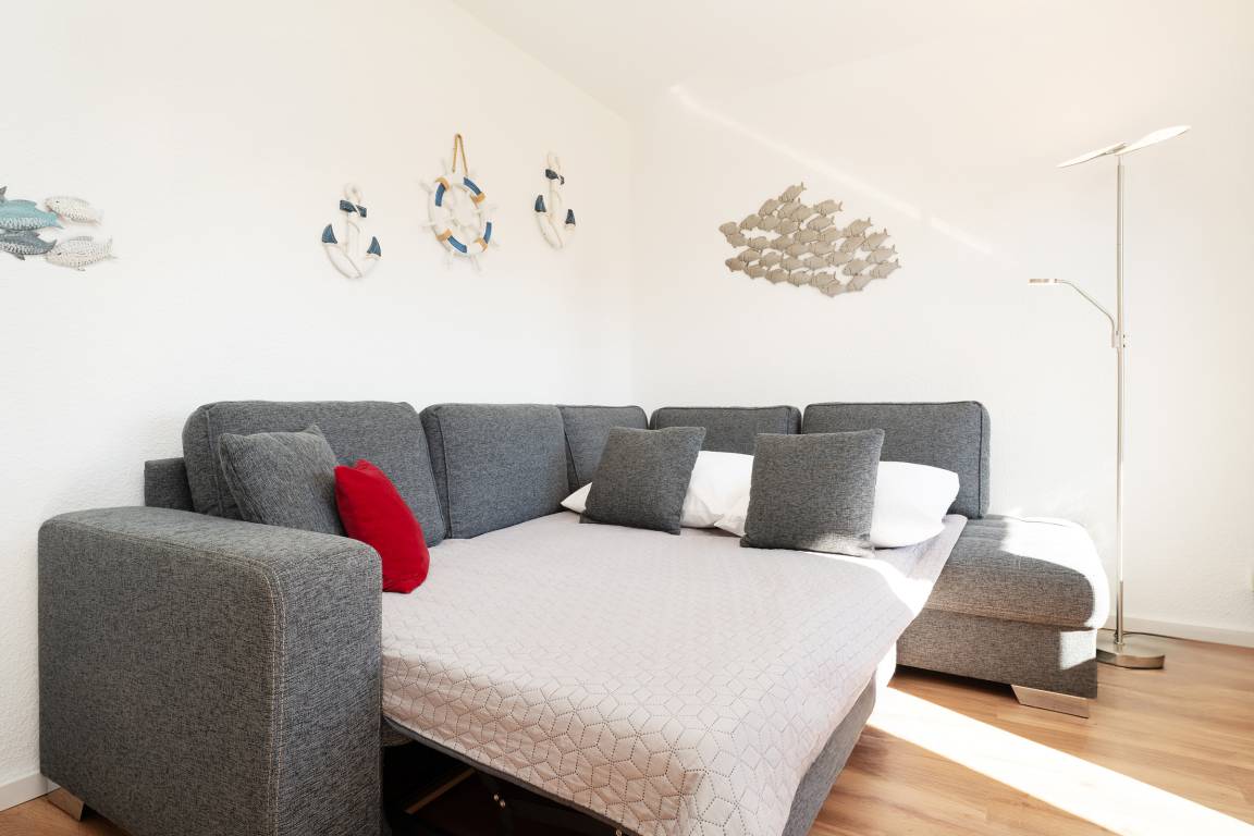 Die modern ausgestattete Ferienwohnung liegt im Hochparterre eines gepflegten Hauses in zentraler Lage von Grömitz. Der Wohnbereich bietet eine gemütliche Sitzecke, einen Flachbild-TV, CD-Player und ein Radio. Vom Wohnzimmer aus gelangen Sie direkt auf den Balkon, der mit Gartenmöbeln ausgestattet ist. Die separate Küche ist mit einer Kaffeemaschine, Mikrowelle, Wasserkocher, Toaster, Spülmaschine und einem 4-Platten-Induktionsherd ausgestattet. Das Schlafzimmer verfügt über ein bequemes Doppelbett, ein weiteres Wohn-/Schlafzimmer ist mit einer Schlafcouch ausgestattet und bietet zusätzlichen Raum zur Erholung. Das Badezimmer verfügt über eine Dusche, sowie über ein Waschbecken und ein WC. Ein Kinderhochstuhl sowie ein Kinderreisebett stehen zur Verfügung.