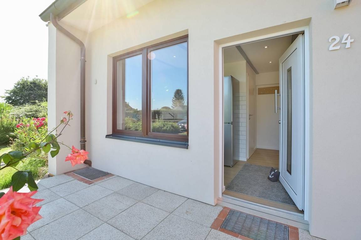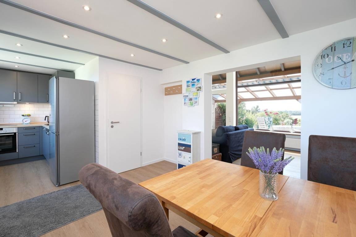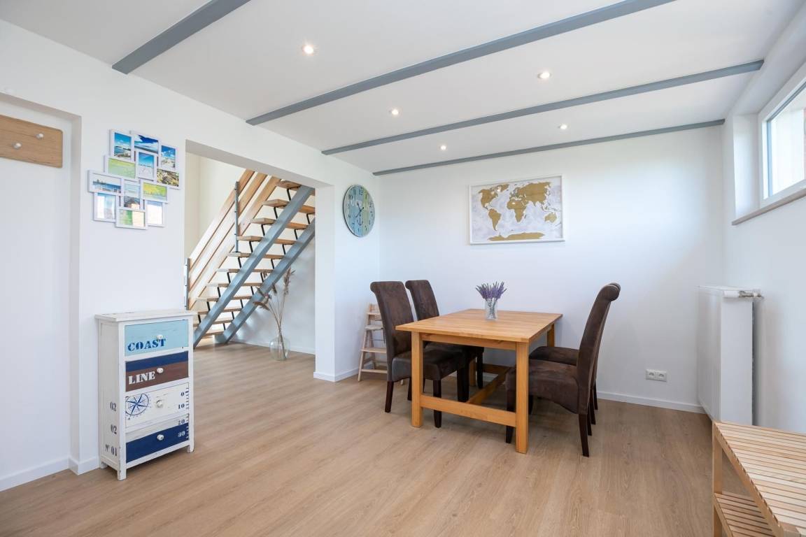 Als besonderes Highlight erhalten Sie einen Gratis-Besuch im Zoo Arche Noah in Grömitz. Öffnen Sie die Tür in Ihren Urlaub und fühlen Sie sich sofort zu Hause im großen freundlichen Esszimmer mit angrenzender Küche. Hier kommt die Familie zusammen und kann beim Essen oder Spielen wertvolle Zeit miteinander verbringen. Die moderne voll ausgestattete Küche lässt keine Wünsche offen, ein Herd mit 4 Kochfeldern und Backofen, großer Kühl-/Gefrierkombination, Spülmaschine, Kaffeemaschine, Eierkocher, Mixer, Toaster und Wasserkocher gehören zum Inventar. Im offenen lichtdurchfluteten Wohnzimmer mit gemütlicher Couchgarnitur, Kamin und TV (mit Fire-TV-Stick zur Nutzung von Netflix, Amazon Prime etc.) haben Sie Zugang zur wunderschönen 26 m² großen möblierten, überdachten Terrasse mit Garten. Diesen erreichen Sie über eine Holztreppe. Verbringen Sie behagliche Stunden mit freiem Blick auf das Feld, oder lassen Sie sich an der Feuerstelle einen selbst gegrillten, fangfrischen Ostseefisch schmecken. Das geschmackvolle Tageslicht-Bad im Erdgeschoss verfügt über eine komfortable bodentiefe Dusche, Handtuchheizung, WC, Fön und Waschmaschine. Im Obergeschoss mit Dachschrägen befindet sich ein Schlafzimmer mit bequemem Doppelbett (2x 90x200 cm) und Kleiderschrank, sowie ein zweites Schlafzimmer mit 2 Einzelbetten (je 90x200 cm) und kleinem Kleiderschrank für die Urlaubsgarderobe. Die Velux-Fenster lassen sich zur Nachtruhe jeweils mit einem Rollo verdunkeln.