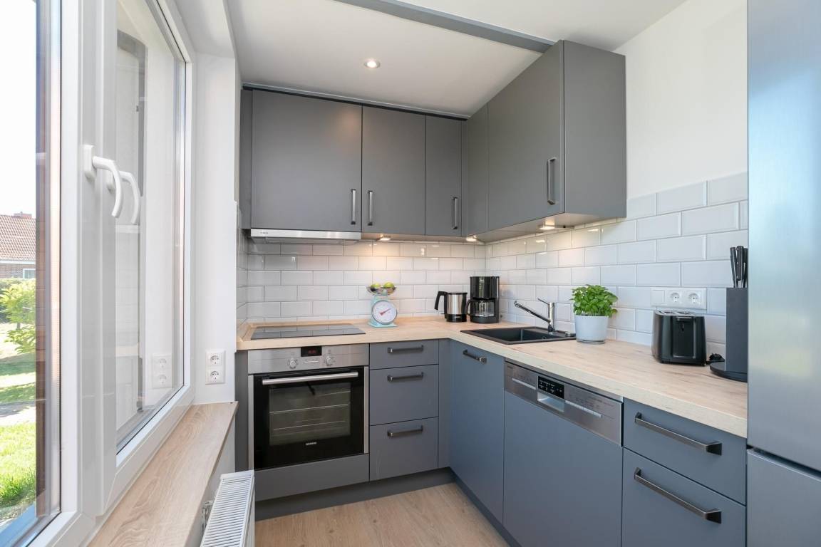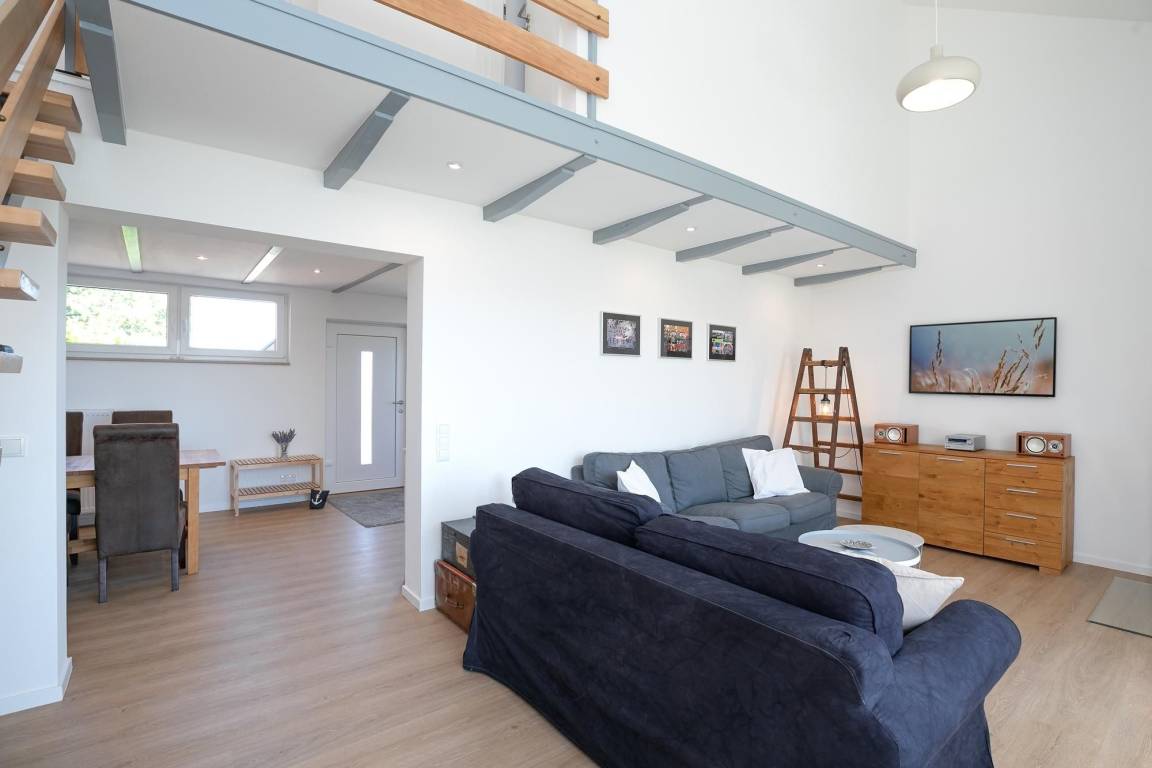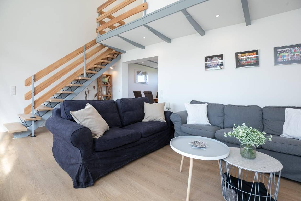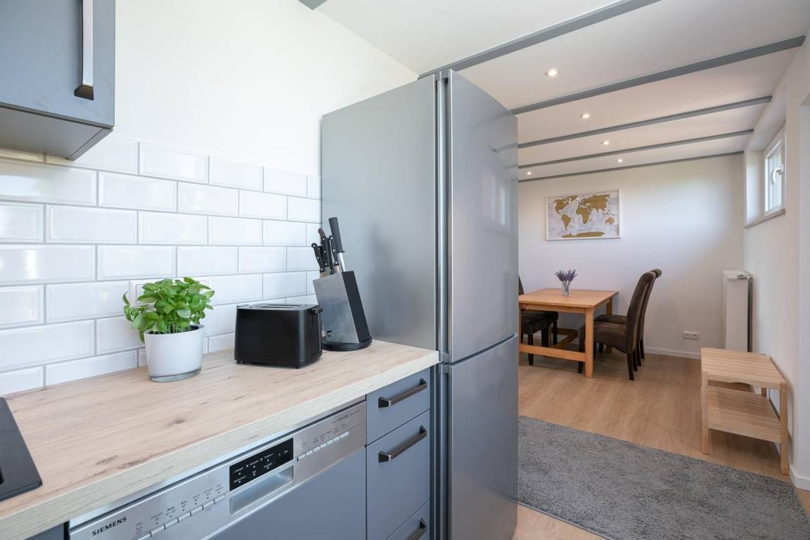Als besonderes Highlight erhalten Sie einen Gratis-Besuch im Zoo Arche Noah in Grömitz. Öffnen Sie die Tür in Ihren Urlaub und fühlen Sie sich sofort zu Hause im großen freundlichen Esszimmer mit angrenzender Küche. Hier kommt die Familie zusammen und kann beim Essen oder Spielen wertvolle Zeit miteinander verbringen. Die moderne voll ausgestattete Küche lässt keine Wünsche offen, ein Herd mit 4 Kochfeldern und Backofen, großer Kühl-/Gefrierkombination, Spülmaschine, Kaffeemaschine, Eierkocher, Mixer, Toaster und Wasserkocher gehören zum Inventar. Im offenen lichtdurchfluteten Wohnzimmer mit gemütlicher Couchgarnitur, Kamin und TV (mit Fire-TV-Stick zur Nutzung von Netflix, Amazon Prime etc.) haben Sie Zugang zur wunderschönen 26 m² großen möblierten, überdachten Terrasse mit Garten. Diesen erreichen Sie über eine Holztreppe. Verbringen Sie behagliche Stunden mit freiem Blick auf das Feld, oder lassen Sie sich an der Feuerstelle einen selbst gegrillten, fangfrischen Ostseefisch schmecken. Das geschmackvolle Tageslicht-Bad im Erdgeschoss verfügt über eine komfortable bodentiefe Dusche, Handtuchheizung, WC, Fön und Waschmaschine. Im Obergeschoss mit Dachschrägen befindet sich ein Schlafzimmer mit bequemem Doppelbett (2x 90x200 cm) und Kleiderschrank, sowie ein zweites Schlafzimmer mit 2 Einzelbetten (je 90x200 cm) und kleinem Kleiderschrank für die Urlaubsgarderobe. Die Velux-Fenster lassen sich zur Nachtruhe jeweils mit einem Rollo verdunkeln.