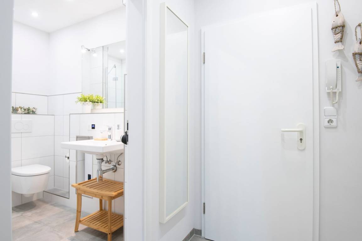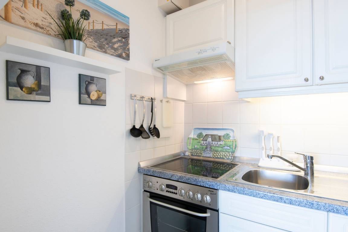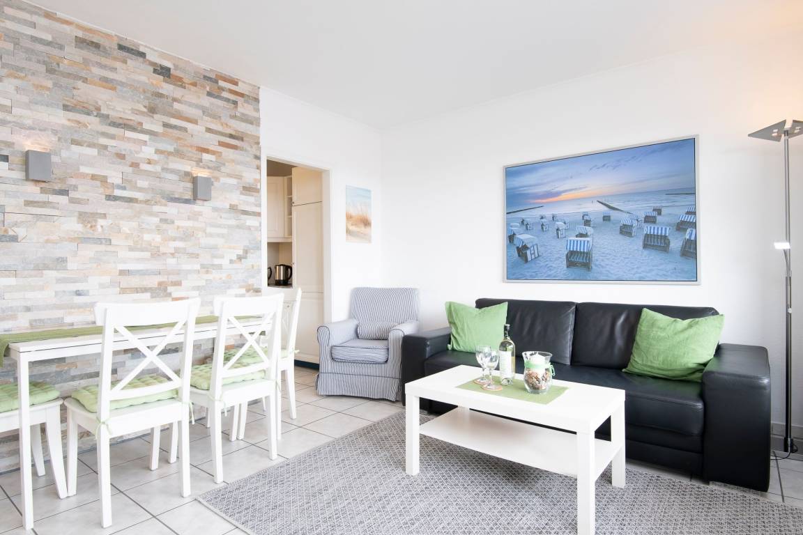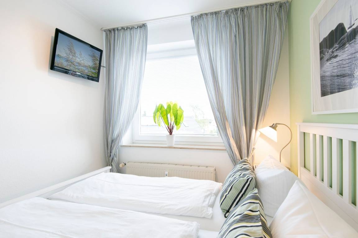 Mit dem Fahrstuhl gelangen Sie bequem in die 2. Etage und erreichen Ihr Urlaubsdomizil. Der Flur führt Sie geradeaus in den Wohn- und Essbereich mit Zugang zum möblierten Balkon. Im Wohnbereich befinden sich eine gemütliche Schlafcouch sowie ein Flachbildfernseher. Ein Esstisch mit ausreichend Platz für 4 Personen ist ebenfalls vorhanden. Die kleine Küche befindet sich in einem Nebenraum zum Wohnbereich und ist z. B. mit einem Induktionsherd, einem Kühlschrank und einem Geschirrspüler gut ausgestattet. Das separate Schlafzimmer mit Fenster wurde mit einem komfortablen Doppelbett (2x 80x200 cm) sowie einem Fernseher eingerichtet. Für Verdunklung in der Nacht sorgen Plissees an den Fenstern. Das innenliegende Badezimmer erwartet Sie mit einer bodengleichen Dusche sowie einem beheizbaren Handtuchhalter.