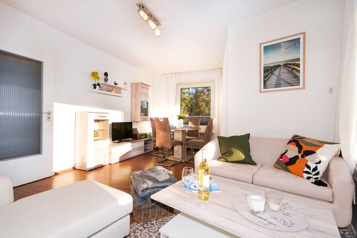 Das gemütlich eingerichtete Wohnzimmer bietet Ihnen ein Sofa, eine Schlafcouch (160 x 120 cm) und einen Esstisch mit 4 Stühlen. Ein SAT-Flat-TV und kostenloses W-LAN laden zu entspannten Abenden ein. Vom Wohnzimmer gelangen Sie direkt auf den Balkon.