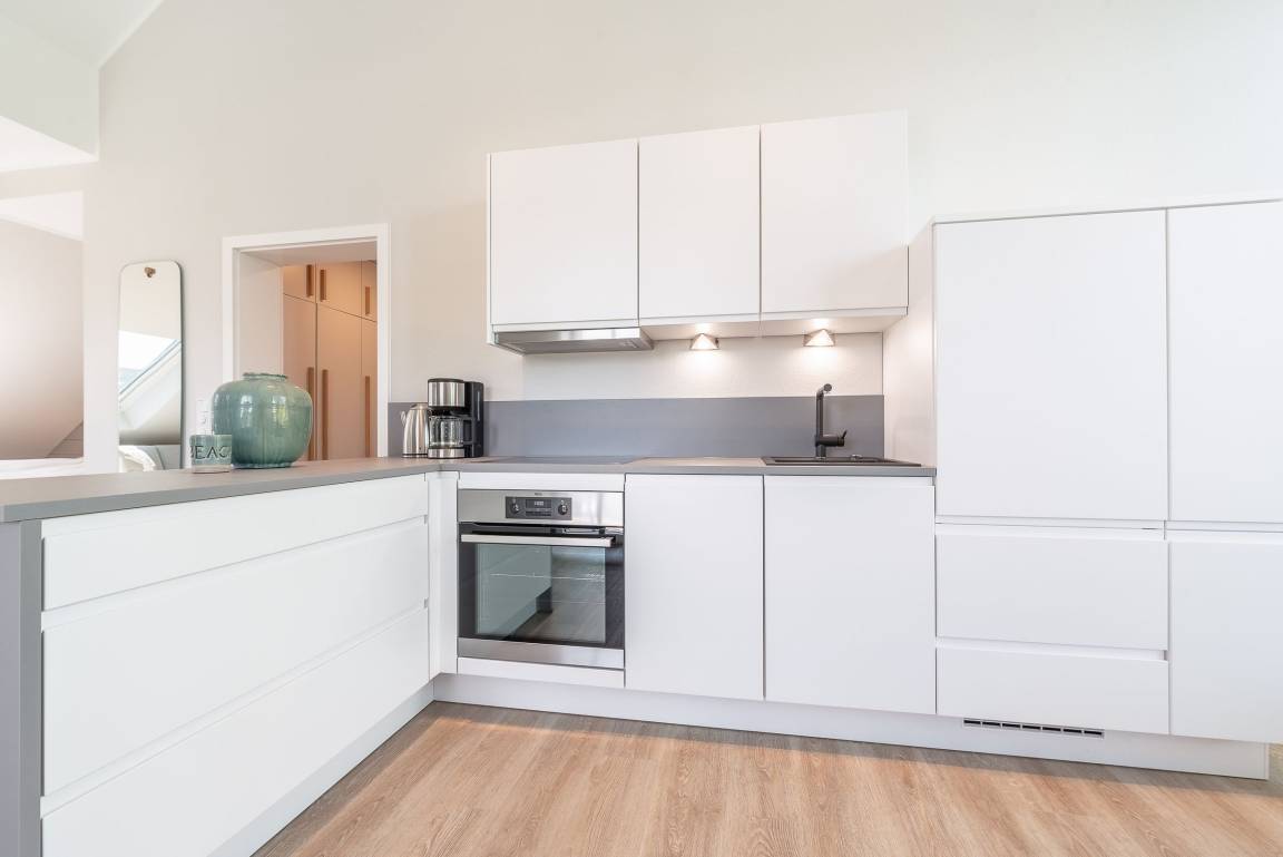 Die hochwertige Küche wurde perfekt in den großzügigen Wohnraum integriert. Hier zaubern Sie problemlos ein sterneverdächtiges Menü für Zwei!