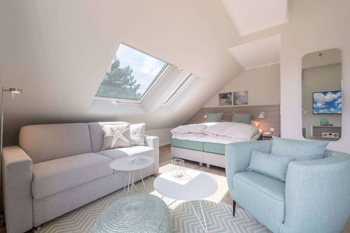 Eine große Fensterfront erfüllt den offen gestalteten Wohn-Schlafraum mit wohligem Tageslicht und sorgt für Wohlfühl-Ambiente vom ersten Moment an! Das hochwertige Boxspringbett bietet eine kuschelige Schlafmöglichkeit für zwei Personen (Liegefläche 160x200cm).