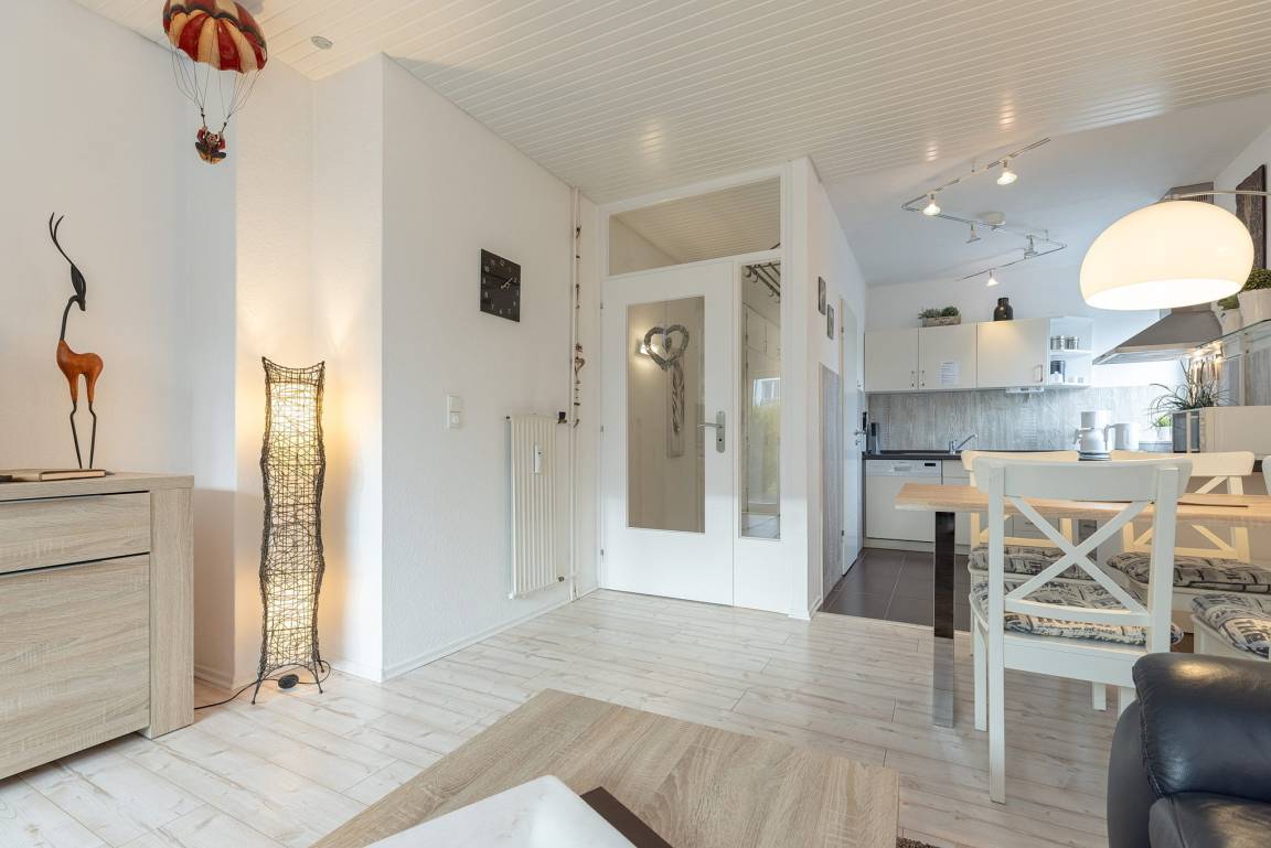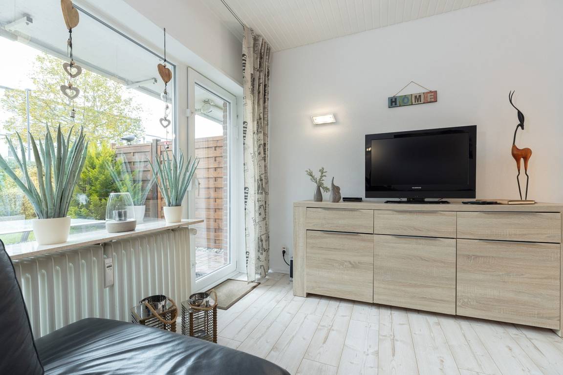 Der helle moderne Wohn-/Essbereich mit direktem Zugang zur Terrasse verfügt über einen Essplatz für 4 Personen. Zur Unterhaltung stehen ein Flachbild-TV und der Boden ist mit Laminatboden ausgelegt. Die Fenster lassen sich durch einen Außenrollladen verdunkeln.