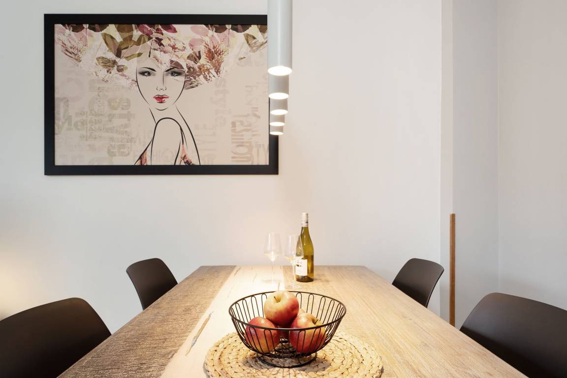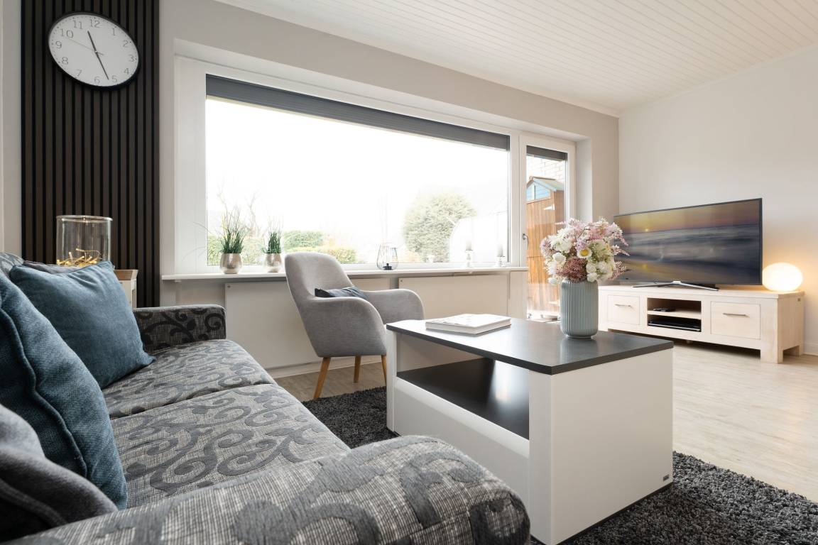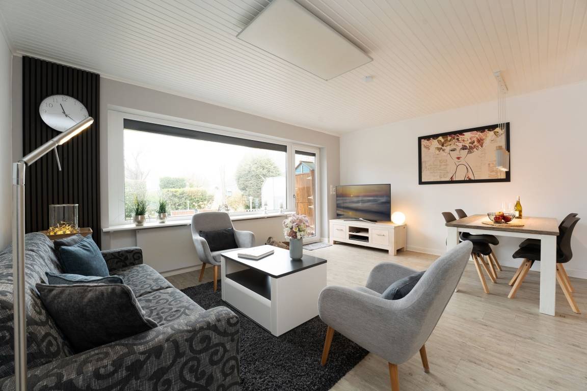Das offene, tageslichtdurchflutete Wohn-Esszimmer bietet mit einer großzügigen Couch reichlich Platz für gemütliche Abende vor dem Fernseher. Über einen kostenlosen WLAN-Anschluss bleiben Sie auch im Urlaub erreichbar. Die Couch lässt sich im Handumdrehen zu einer weiteren Schlafstätte (140x200 cm) für 2 Personen ausziehen. Die integrierte Küche bietet sämtliche Annehmlichkeiten, die Hobby-Koch-Herzen zum Schlagen bringen inklusive Nespresso-Maschine für heißen, leckeren Kaffee. Der angrenzende Essbereich bietet Platz für bis zu vier Personen. Bei Sonnenschein lädt die idyllische Terrasse zu einem leckeren Frühstück im Freien ein. Ruhe und Erholung finden Sie zudem im separaten Schlafzimmer mit komfortablem Doppelbett (180x200 cm). Zwei Kleiderschränke bieten ausreichend Stauraum für Ihre Urlaubsgarderobe.