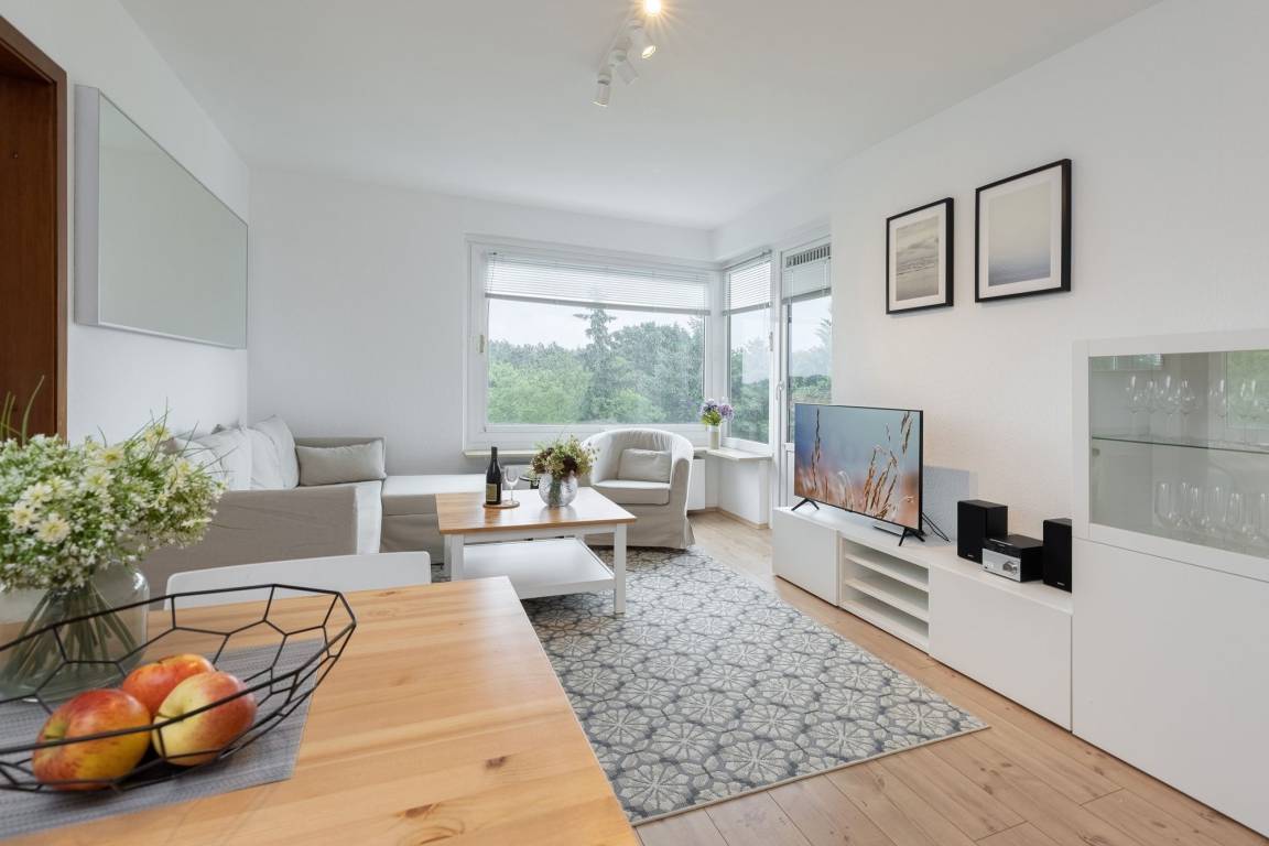 Auf ca. 54 m² eröffnet sich Ihnen Ihr helles, elegant eingerichtetes Feriendomizil. Im kleinen Flur mit Einbauschrank können Sie Ihre mitgebrachte Urlaubsgarderobe mühelos verstauen. Im Wohnbereich finden Sie auf dem Ecksofa ein gemütliches Plätzchen zum Entspannen, bei Bedarf kann dies zur Nacht in eine kuschelige Schlafstätte für 1 Person verwandelt werden. Gemeinsam essen, trinken und genießen Sie am vorhandenen Esstisch, untermalt von Ihrer Lieblingsmusik, die Sie über den kostenlosen WLAN-Anschluss streamen können. Der niedliche Balkon mit tollem seitlichem Meerblick lädt zu einem guten Glas Wein oder entspannten Lesestunden ein. In der süßen, modernen Küche ist an alles gedacht worden und Sie können selbst entscheiden, ob Sie heute selber kochen oder doch lieber das umfangreiche gastronomische Angebot in Grömitz entdecken möchten. 2 Schlafzimmer mit jeweils einem Doppelbett (2x 90x200 cm und 140x200 cm) und Kleiderschrank sorgen für traumhafte Nächte. Starten Sie erfrischt in den Tag im frisch renovierten Badezimmer mit großzügiger Regendusche.