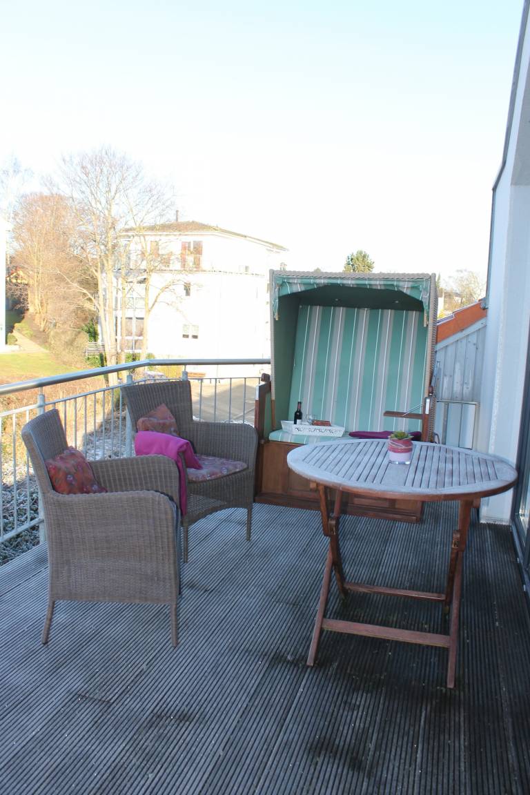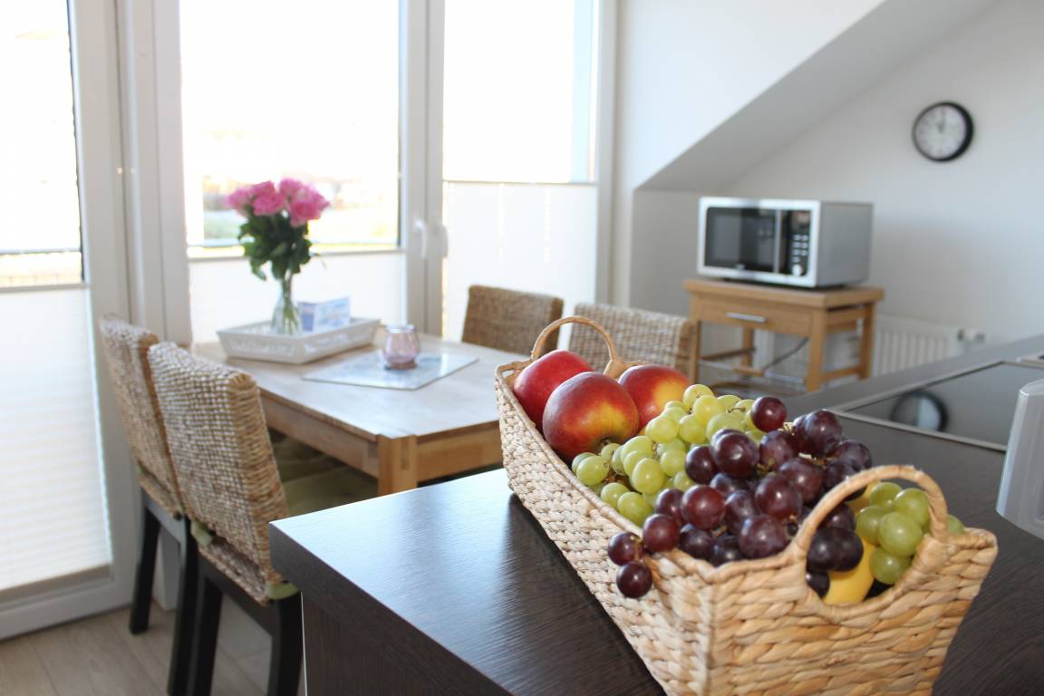 Die integrierte Küchenzeile ist u.a. mit einer Geschirrspülmaschine, einem Backofen, einer Waschmaschine und vielen weiteren Küchengeräten wie z.B. einer Kaffeemaschine, einem Toaster und einem Wasserkocher ausgestattet. Ebenso befindet sich hier ein Essplatz für vier Personen. Direkt an die Küche grenzt die Dachterrasse, von hier aus können Sie schon morgens die herrliche Ostseeluft genießen. Das separate Schlafzimmer ist mit einem Doppelbett (Maße - 1,80 m x 2 m - getrennte Matratzen) und einem großen Kleiderschrank versehen, ein kleiner Abstellraum steht Ihnen hier zur Verfügung.) Das Badezimmer ist voll ausgestattet mit einer Badewanne mit Duschfunktion, einem großen Spiegel, einer Handtuchheizung sowie Waschbecken / WC.
