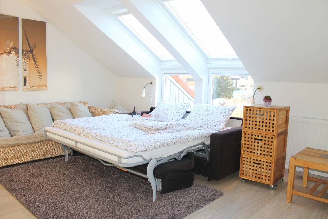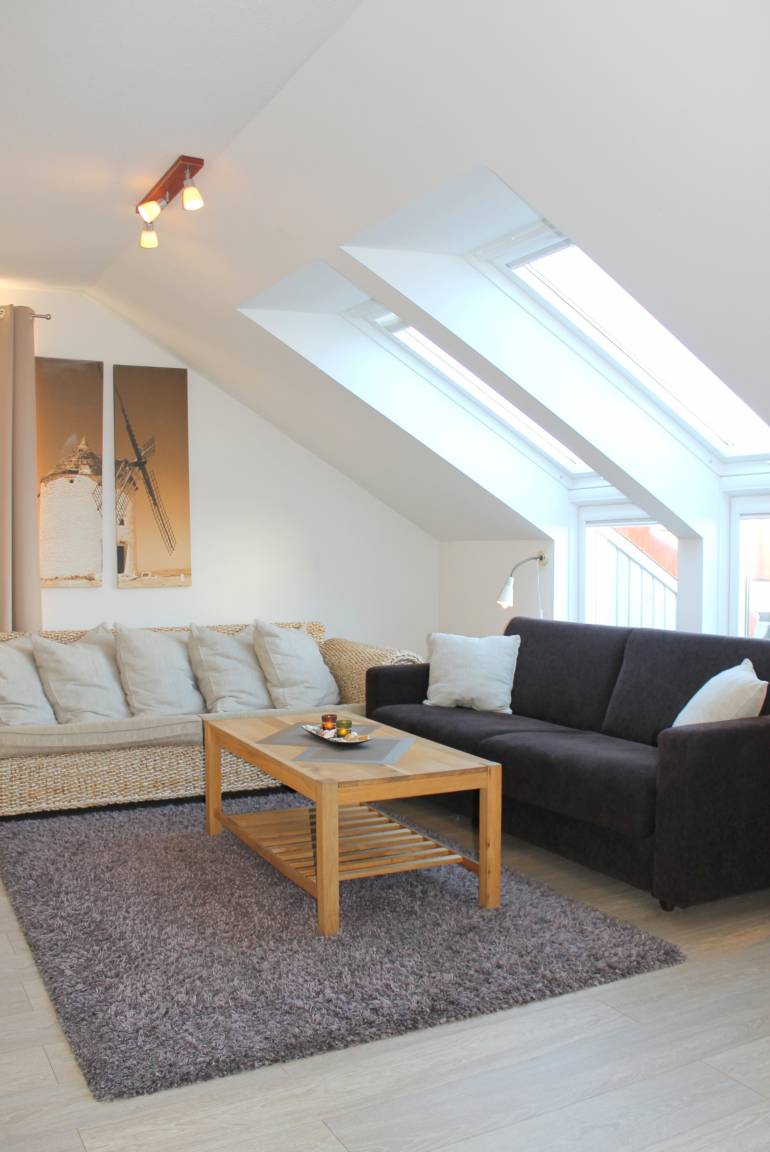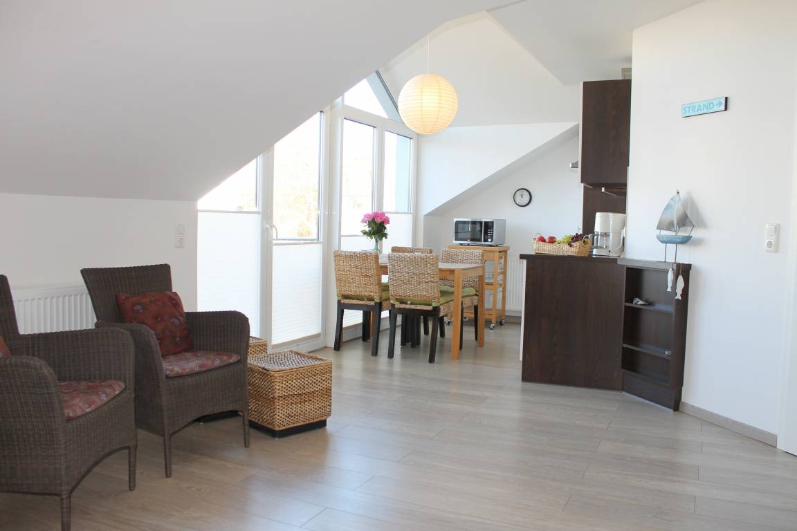 Der helle Wohnraum lädt im Winter sowie im Sommer zum Verweilen ein. Ob im Sommer im Strandkorb auf der großen Dachterrasse oder im Winter im Strandkorb im Wohnzimmer - Ostseeurlaub im Strandkorb ist hier 365 Tage möglich.