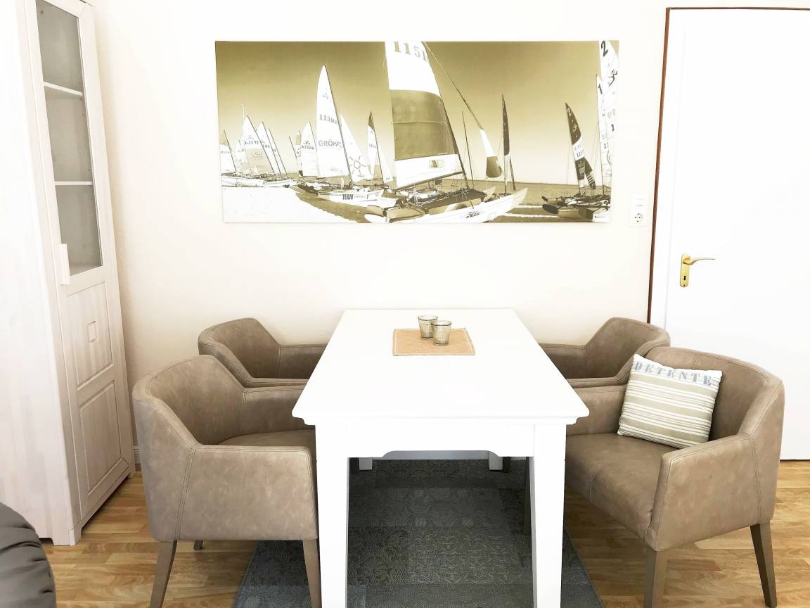 Das Wohnzimmer mit Essecke ist ein Ort für Gemütlichkeit und gesellige Stunden. Genießen Sie in dem lichtdurchfluteten Raum oder auf dem Balkon (südwest) Ihr Frühstück bevor Sie in den Tag starten. Die bequeme Sitzecke, Sessel und Flachbildschirm laden zum Faulenzen ein, während nebenan in der separaten Küche das Abendessen zubereitet wird.