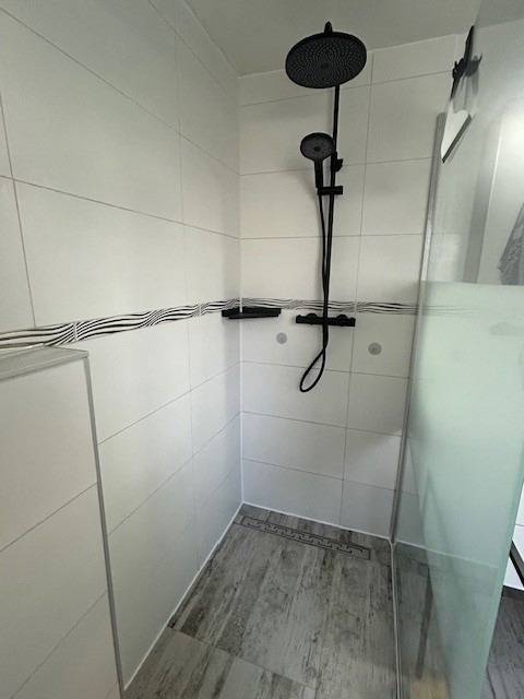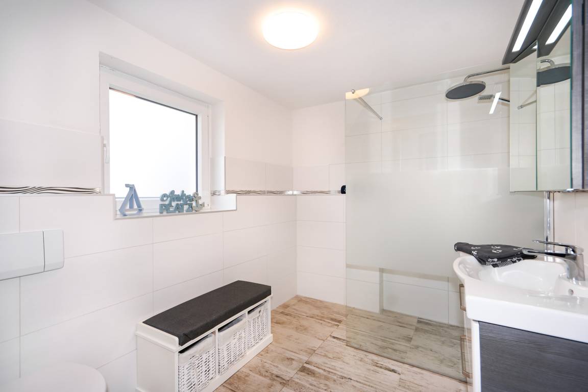 Das große Schlafzimmer stellt ein Doppelbett (2x90x200) zur Verfügung. Das Kinderschlafzimmer verfügt über ein Etagenbett und einen Kleiderschrank. Zwei Stufen führen in das Kinderzimmer. Die Ausstattung im Bad lässt keine Wünsche übrig: das Tageslichtbad bietet Ihnen eine Walk-in-Dusche, einen Waschtisch und ein WC.
