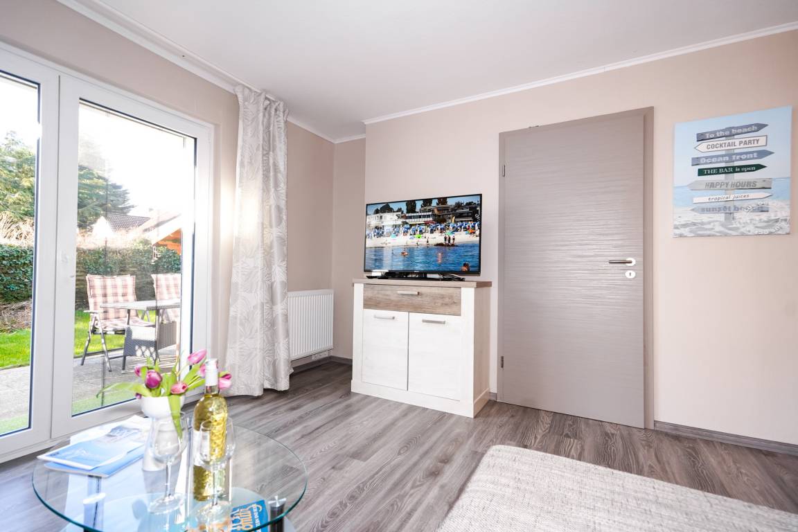 Das Wohnzimmer bietet Ihnen eine großzügige Eckcouch und einen großen Flachbild-TV (Magenta). Von hier aus gelangen Sie auf die neu gestaltete Terrasse.