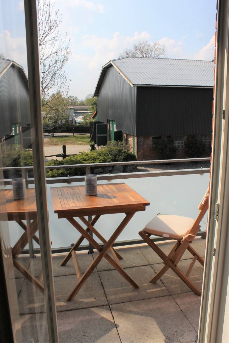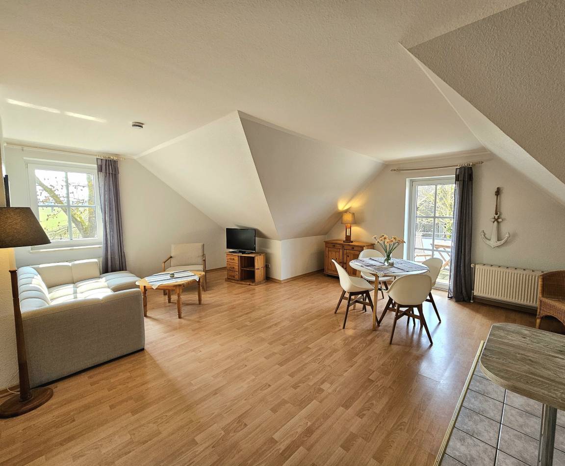 Die Wohnung "Nr. 7" auf dem "Grömitzer Pappelhof" liegt in der 1. Etage und bietet Platz für bis zu 5 Personen. Die Wohnfläche der ca. 80 m² großen Ferienunterkunft verteilt sich auf ein Wohn- / Esszimmer, zwei separate Schlafzimmer, einen Flur und auf ein Badezimmer. Das Wohn- / Esszimmer ist mit einer gemütlichen Sitzecke, Flachbild-TV, einem Esstisch und einer offenen Küchenzeile versehen. Von hier aus haben Sie Zugang zum möblierten kleinen Balkon. Die Küche ist u.a. mit 4-Plattenherd, Kaffeeemaschine und weiteren Küchengeräten versehen. Eins der beiden Schlafzimmer ist mit einem Doppelbett (getrennte Matratzen - Maße 0,90 x 2,00 m) und einem großen Kleiderschrank versehen. Das zweite Schlafzimmer verfügt über zwei Einzelbetten (0,90 x 2,00 m), eine Sitzgelegenheit sowie einen Kleiderschrank. Das Tageslicht-Badezimmer ist mit WC und Dusche versehen. Über den Flur gelangen Sie in alle Räume.