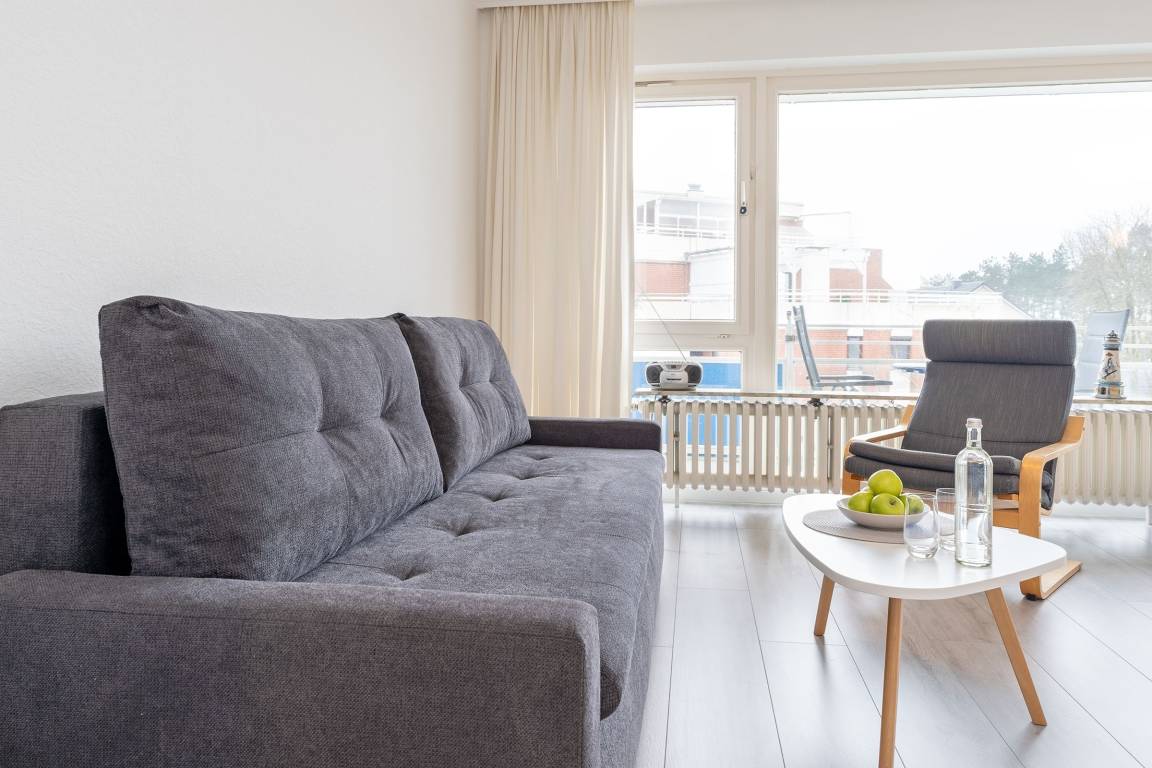 Diese geschmackvoll eingerichtete Ferienwohnung bietet Ihnen einen entspannten Urlaub an der wunderschönen Ostseeküste. Es empfängt Sie ein gemütlicher Wohnbereich mit einer Schlafcouch (160x200 cm). Die großen Fenster sorgen für viel Licht und der angrenzende Balkon lädt zum Verweilen im Freien ein. In der Küche mit einer umfangreichen Ausstattung können Sie kulinarische Highlights zaubern. Der Essbereich bietet Platz für die ganze Familie. Das separate Schlafzimmer verfügt über ein komfortables Boxspring-Doppelbett (180x200 cm). Das moderne Tageslichtbad mit Badewanne sorgt für einen gelungenen Start in den Tag.