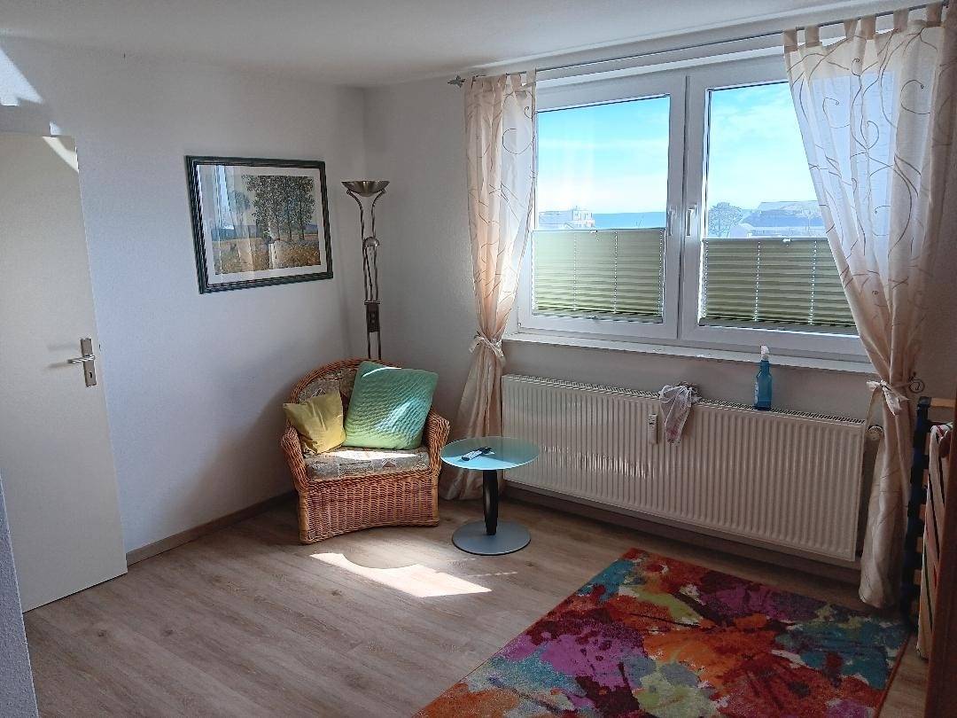 Das Duschbad mit WC hat eine klare und saubere Linie. Von dem höher gelegenen Schlafzimmer, das sehr großzügig gestaltet ist, hat man einen sehr schönen Blick zur Ostsee. Es ist mit Doppelbett, einem Kleiderschrank und einer kleinen Sitzecke ausgestattet.