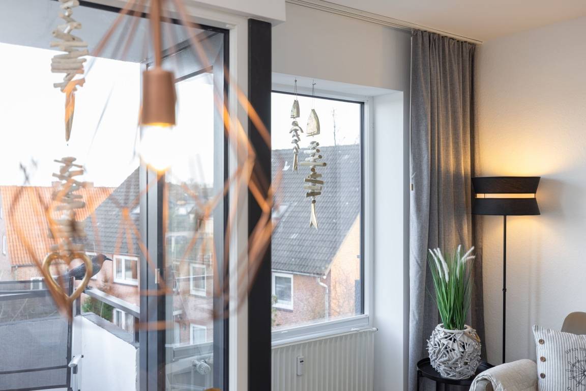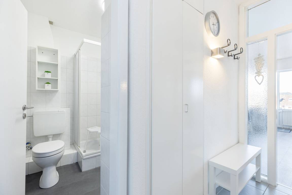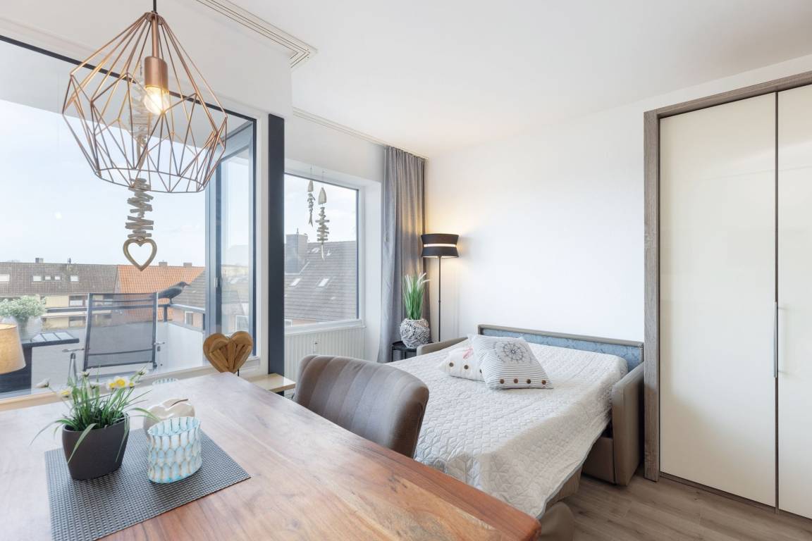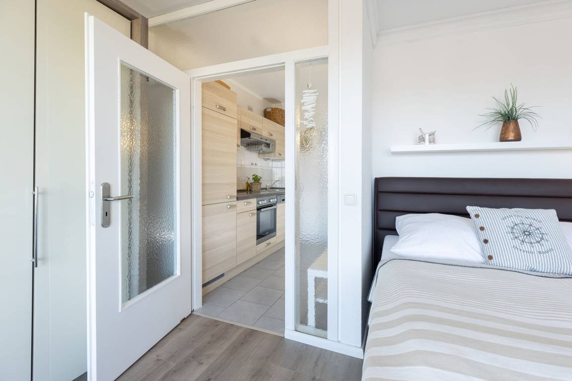 Im Eingangsbereich der Wohnung befindet sich auf der rechten Seite eine Küchenzeile mit hellen Fronten. Hier stehen Ihnen z. B. ein Backofen, ein Kühlschrank sowie ein Geschirrspüler zur Verfügung. Für den täglichen Kaffeegenuss sind eine Kaffee-Filtermaschine und eine Kaffee-Kapselmaschine (Nespresso) vorhanden. Geradeaus an der Küchenzeile vorbei erreichen Sie den kombinierten Wohn- und Schlafbereich mit Zugang zum möblierten Balkon. Als Schlafmöglichkeiten sind ein Boxspringbett (180x200 cm) und ein Schlafsofa (140x200 cm) vorgesehen. Weiterhin sind hier ein Flachbildfernseher und ein Kleiderschrank für Ihre Urlaubsgarderobe vorhanden. Plissees und Vorhänge im Wohnbereich sorgen für eine angenehme Verdunkelung. Der Esstisch mit ausreichend Platz für 3 Personen befindet sich direkt am Fenster und lädt zu gemeinsamen Mahlzeiten ein. Das innenliegende Badezimmer mit Dusche und WC ist hell gefliest und bietet Stauraum für Ihre Badutensilien. Auf dem möblierten Balkon können Sie viele erholsame Urlaubsstunden verbringen.