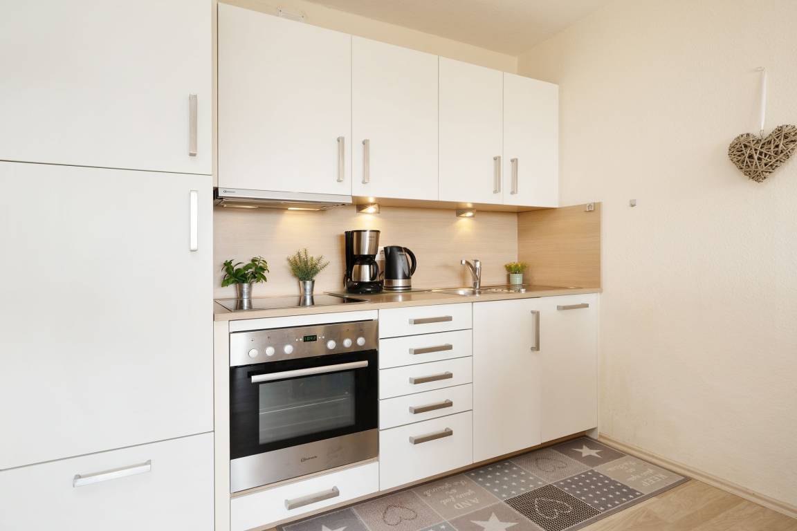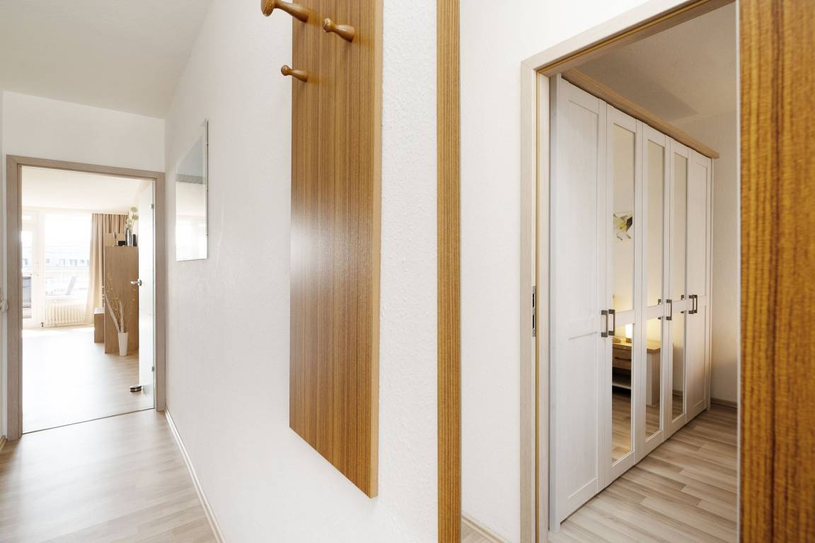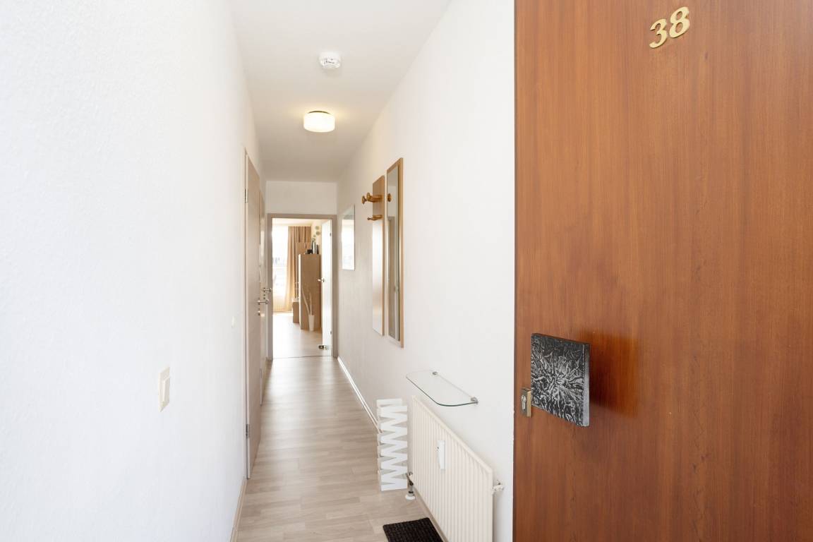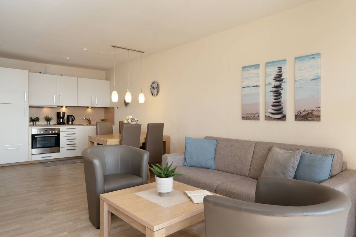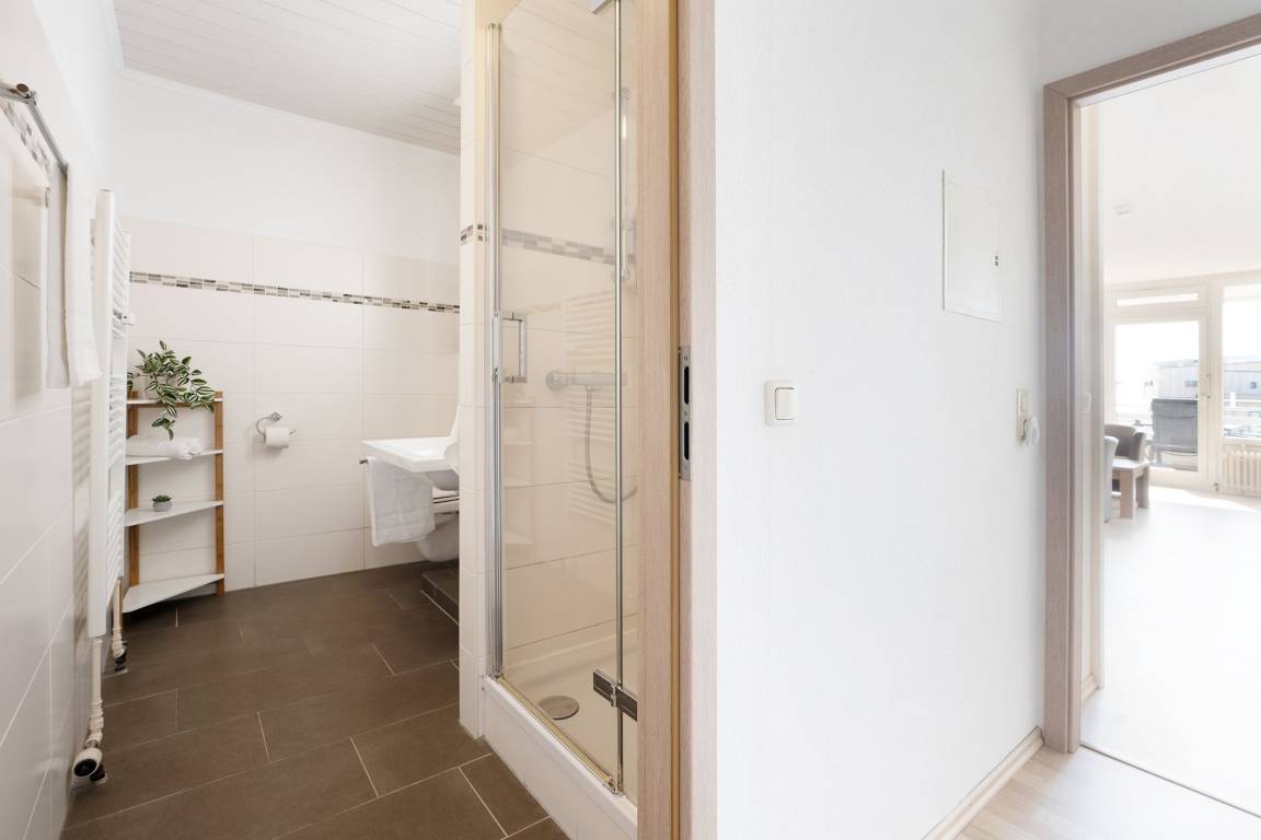 Mit dem Fahrstuhl gelangen Sie direkt in das 2. Obergeschoss, über das Sie Ihre Urlaubsunterkunft erreichen. Auf kurzem Wege durch den Flur gelangen Sie in den hellen Wohn- und Essbereich. Im Wohnbereich erwartet Sie eine gemütliche Couch, die bei Bedarf zum Schlafplatz für zwei weitere Urlaubsgäste umgebaut werden kann. Hier können Sie entspannte Abende vor dem TV verbringen oder Sie lassen den Blick vom Wohnzimmer aus auf die Ostsee schweifen. Für Musik in den Ohren sorgt das inkludierte Bluetooth-Radio. Auch den wohnungseigenen WLAN-Zugang können Sie nutzen. Die Zubereitung von Frühstück, Abendessen und Urlaubssnacks erfolgt nur einen Steinwurf entfernt in der in den Wohnbereich integrierten, voll ausgestatteten Küchenzeile. Highlight dieser tollen Ferienwohnung ist der überdachte, nach Süden ausgerichtete Balkon, auf dem Sie bei jeder Wetterlage das Treiben der Ostsee beobachten können. Nach einem entspannten Abend auf dem Balkon kommen Sie im komfortablen Doppelbett (2x 90x200 cm) des vom Flur abgehenden Schlafzimmers zur Ruhe. Das modern ausgestattete Duschbad rundet diese Ferienwohnung ab.