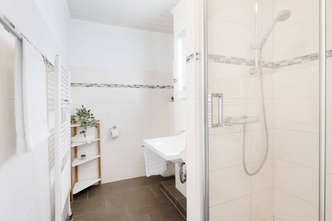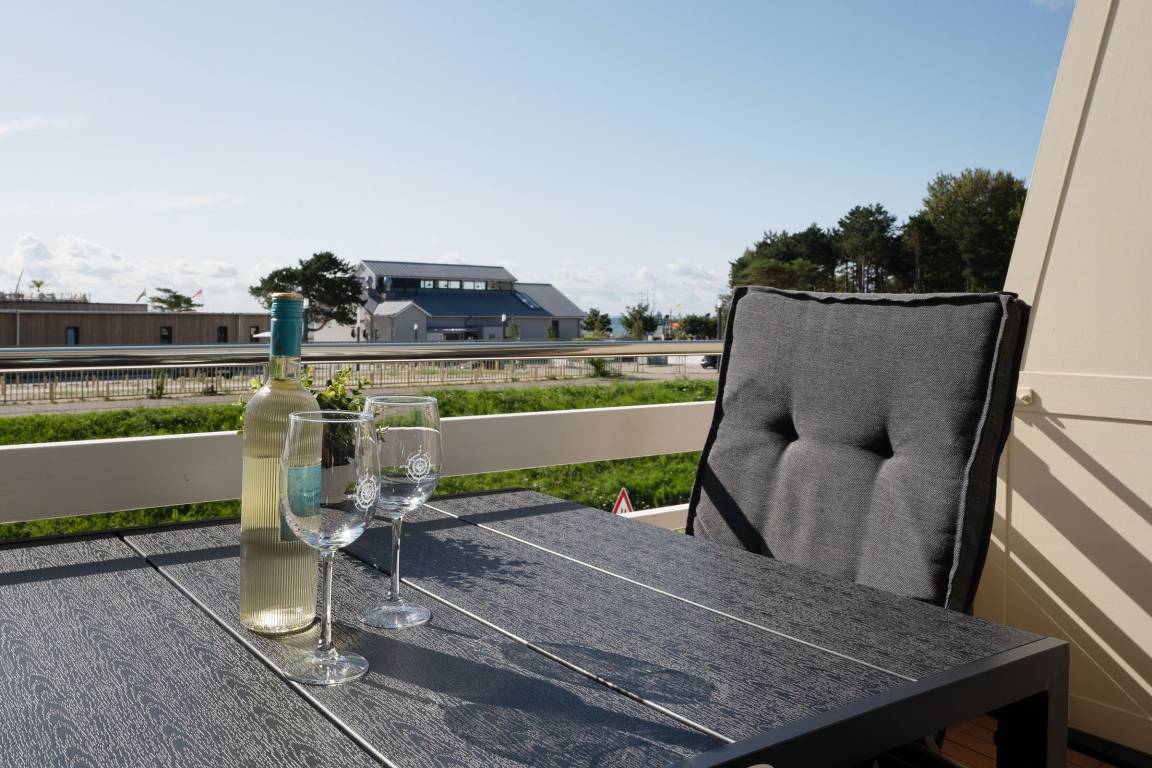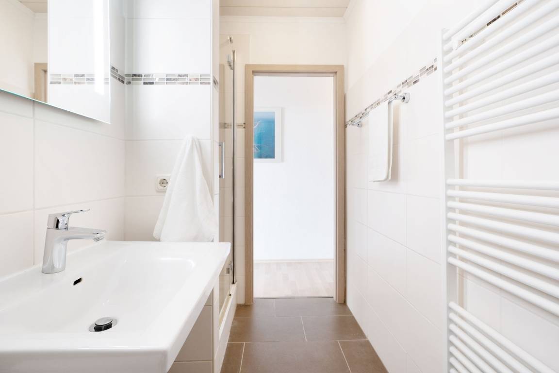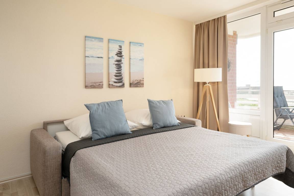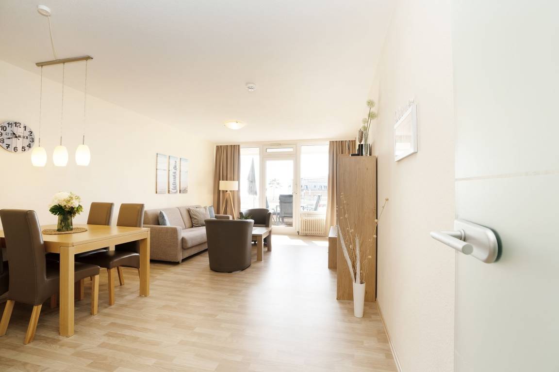 Mit dem Fahrstuhl gelangen Sie direkt in das 2. Obergeschoss, über das Sie Ihre Urlaubsunterkunft erreichen. Auf kurzem Wege durch den Flur gelangen Sie in den hellen Wohn- und Essbereich. Im Wohnbereich erwartet Sie eine gemütliche Couch, die bei Bedarf zum Schlafplatz für zwei weitere Urlaubsgäste umgebaut werden kann. Hier können Sie entspannte Abende vor dem TV verbringen oder Sie lassen den Blick vom Wohnzimmer aus auf die Ostsee schweifen. Für Musik in den Ohren sorgt das inkludierte Bluetooth-Radio. Auch den wohnungseigenen WLAN-Zugang können Sie nutzen. Die Zubereitung von Frühstück, Abendessen und Urlaubssnacks erfolgt nur einen Steinwurf entfernt in der in den Wohnbereich integrierten, voll ausgestatteten Küchenzeile. Highlight dieser tollen Ferienwohnung ist der überdachte, nach Süden ausgerichtete Balkon, auf dem Sie bei jeder Wetterlage das Treiben der Ostsee beobachten können. Nach einem entspannten Abend auf dem Balkon kommen Sie im komfortablen Doppelbett (2x 90x200 cm) des vom Flur abgehenden Schlafzimmers zur Ruhe. Das modern ausgestattete Duschbad rundet diese Ferienwohnung ab.