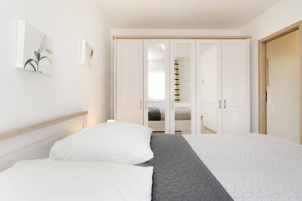 Schlafzimmer: Doppelbett (2x 90x200 cm), Kleiderschrank, Verdunkelung: Außenjalousien, Platz für Babybett vorhanden
