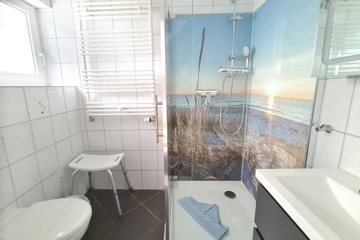 Modernes, hell gefliestes Tageslichtbad mit Dusche, WC und Waschbecken im Erdgeschoss.