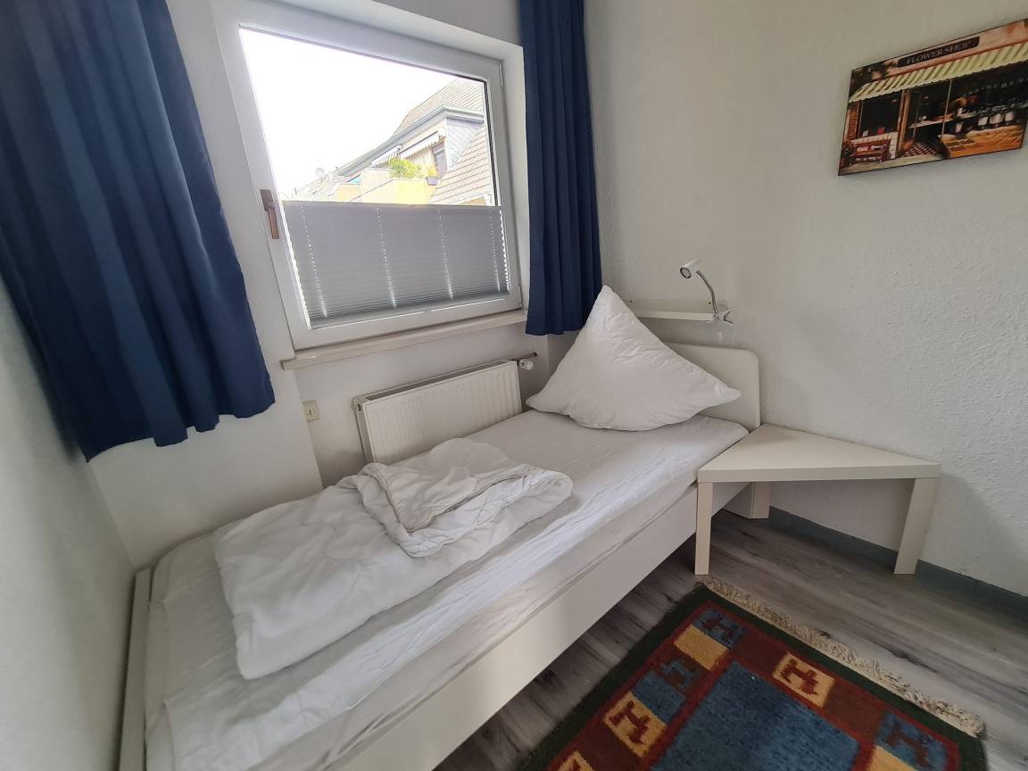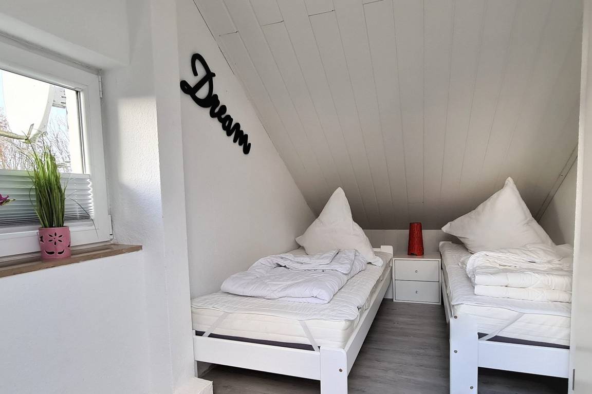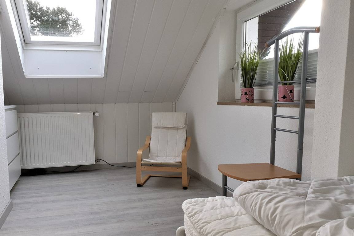 Das Schlafzimmer befindet sich im Obergeschoss und ist mit einem Doppelbett (Größe: 2x80x200cm) und einem Kleiderschrank ausgestattet (bitte beachten Sie, dass die Treppe steil ist). Die Fenster lassen sich mit Rollos verdunkeln. Bettwäsche und Handtücher sind mitzubringen oder anzumieten.
